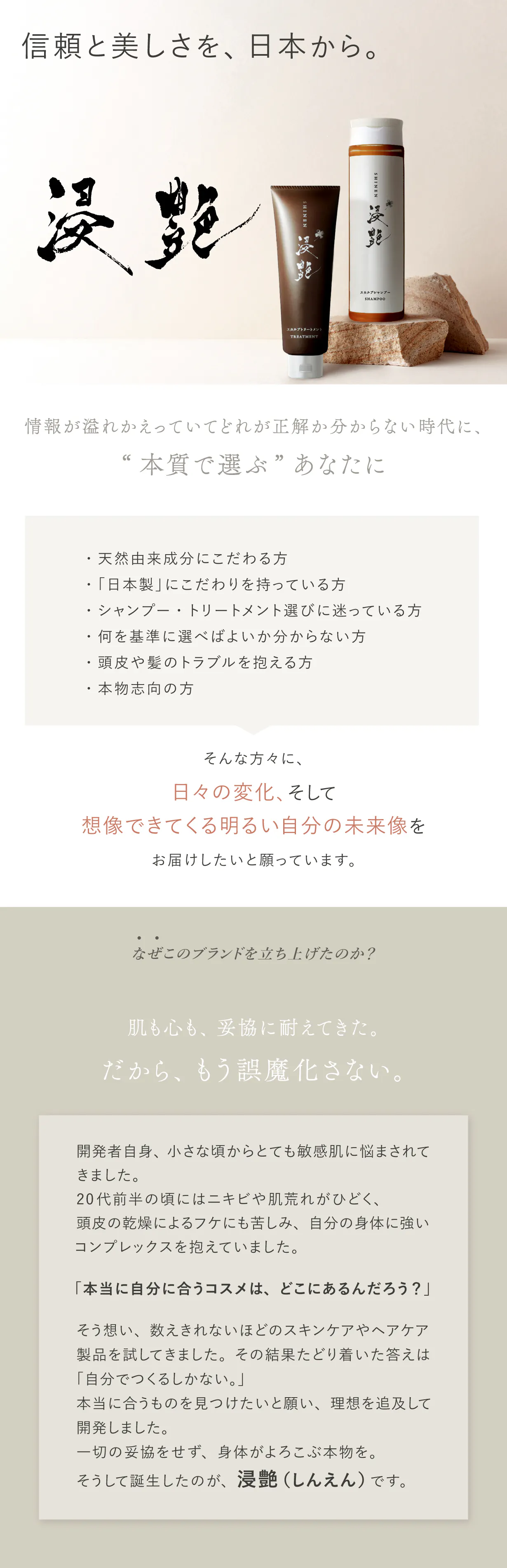 私たちは、美容と健康の分野において「本当に良いものだけを届ける」ことを使命とし、誕生しました。今、世の中には多くのコスメ商品が溢れていますが、成分や製造工程に妥協が見られるものも少なくありません。その中で、「人体にとって本当に安全で、なおかつ効果を最大限に引き出す製品」を追求した結果、私たちは“浸艶(しんえん)”というブランドを立ち上げました。