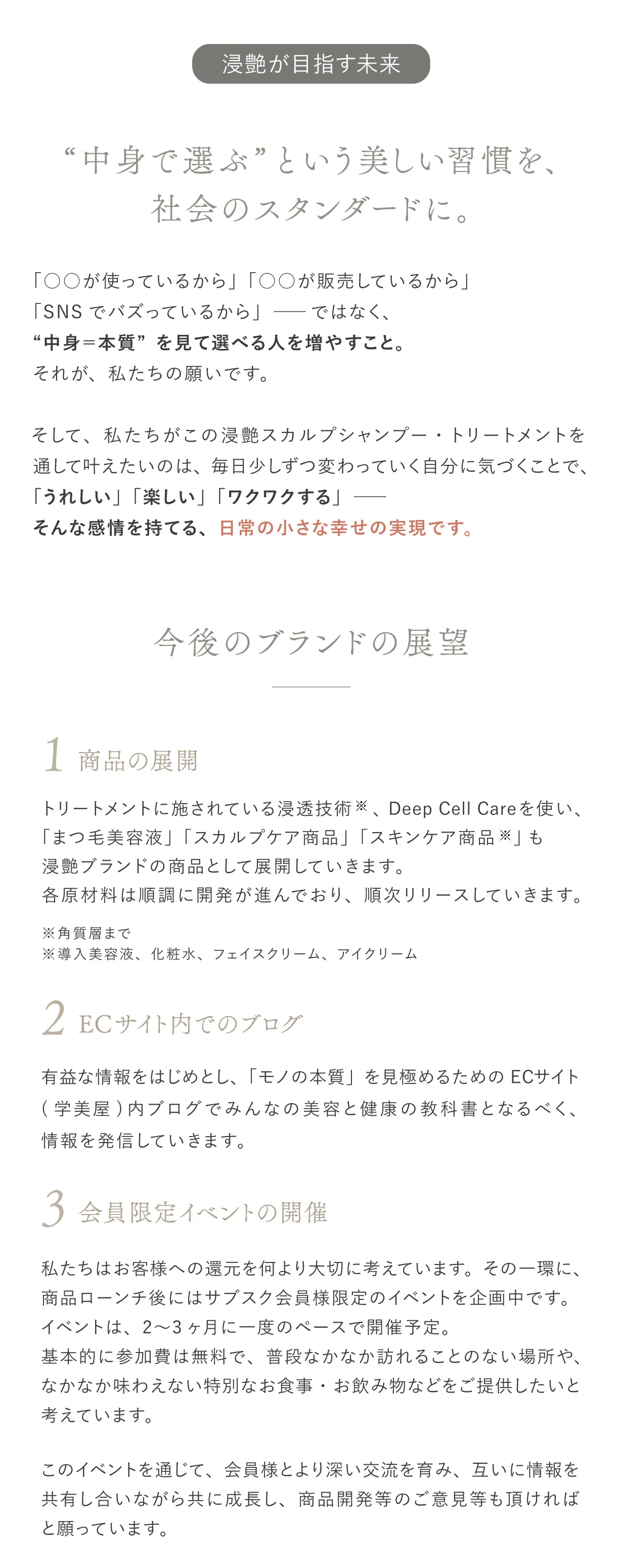 そしてもう一つ、私たちが大切にしているのは、「モノの本質」を見つめ、その価値を正しく伝えていくことです。単なる流行やパッケージに惑わされることなく、目には見えにくい“中身”と“背景”にこそ、本当の価値が宿ると私たちは考えています。だからこそ、成分一つひとつの意味や設計の意図まで、誠実にお伝えしていくことを約束します。