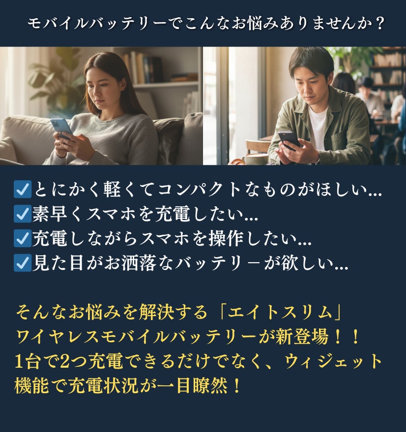 【超得2台割】モバイルバッテリー本体1個 ・エイトスリム×2個 ・専用USBコード×2個 ・取扱説明書 一般発売予定価格:16,000円 割引価格:31%oFF 11,040円 (いずれも税込・送料込み) ※ 割引率は一般販売予定価格に送料を含む合計金額に対するものです。 ※PSEマーク(その他法定表示を含む)表示済み