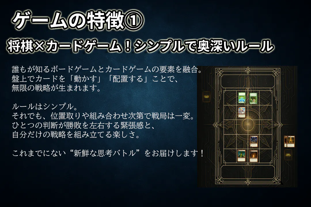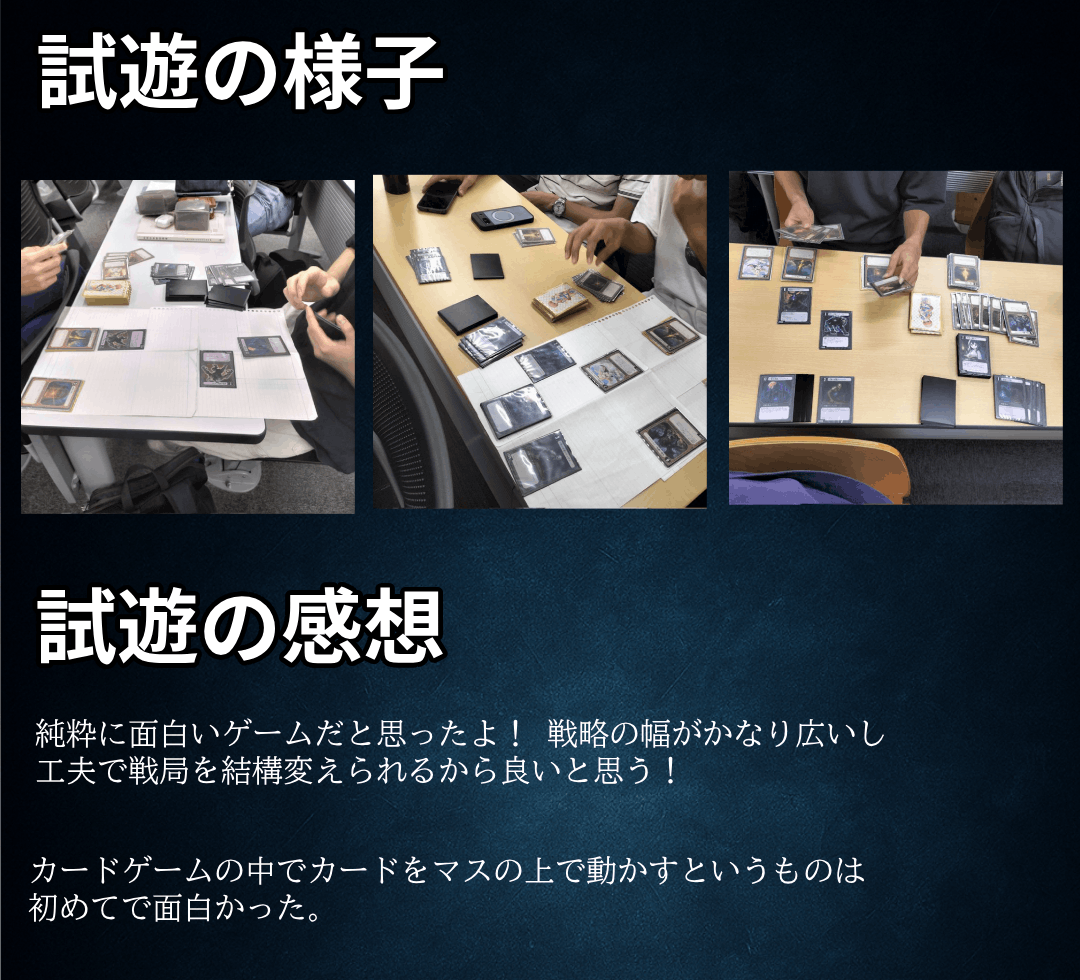 このゲームは、私が友人1人と協力して「自分だけの理想のカードゲームを作りたい」という想いから、開発を始めた作品です。カードデザイン、ルール設計、テストプレイ、ホームページ制作など、すべてを自分たちの手で積み上げてきました。制作の過程では、多くの友人やSNSで出会った方々からのアドバイス・応援をいただき、少しずつ形になってきました。