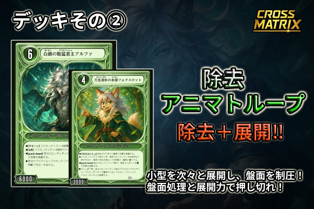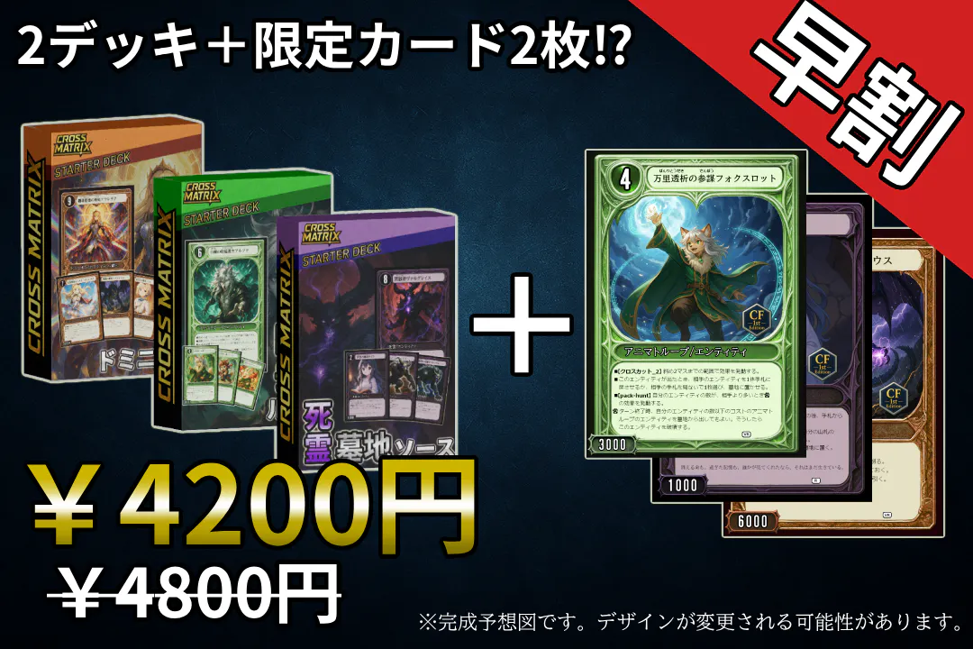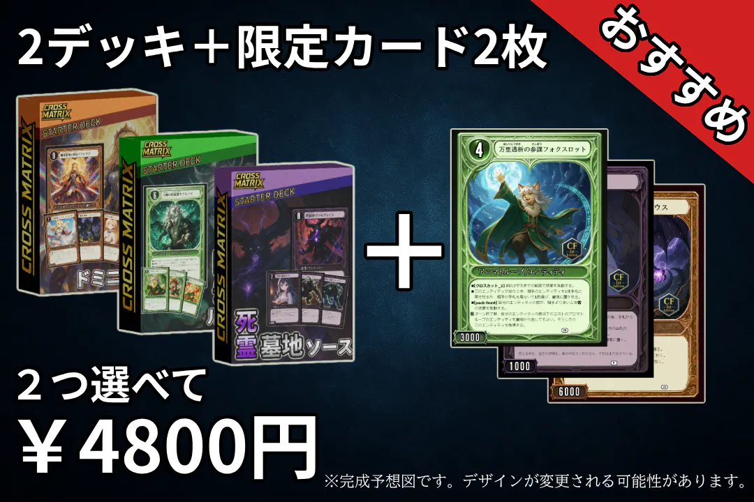 『Cross Matrix』は、カードを“盤上で動かす”ことで生まれる戦略性が特徴の、思考型トレーディングカードゲームです。配置・移動・攻撃のすべてが戦略に直結し、一手の判断が勝敗を左右します。「考えて勝つ快感」を追求した、これまでにないプレイ体験をお届けします。
