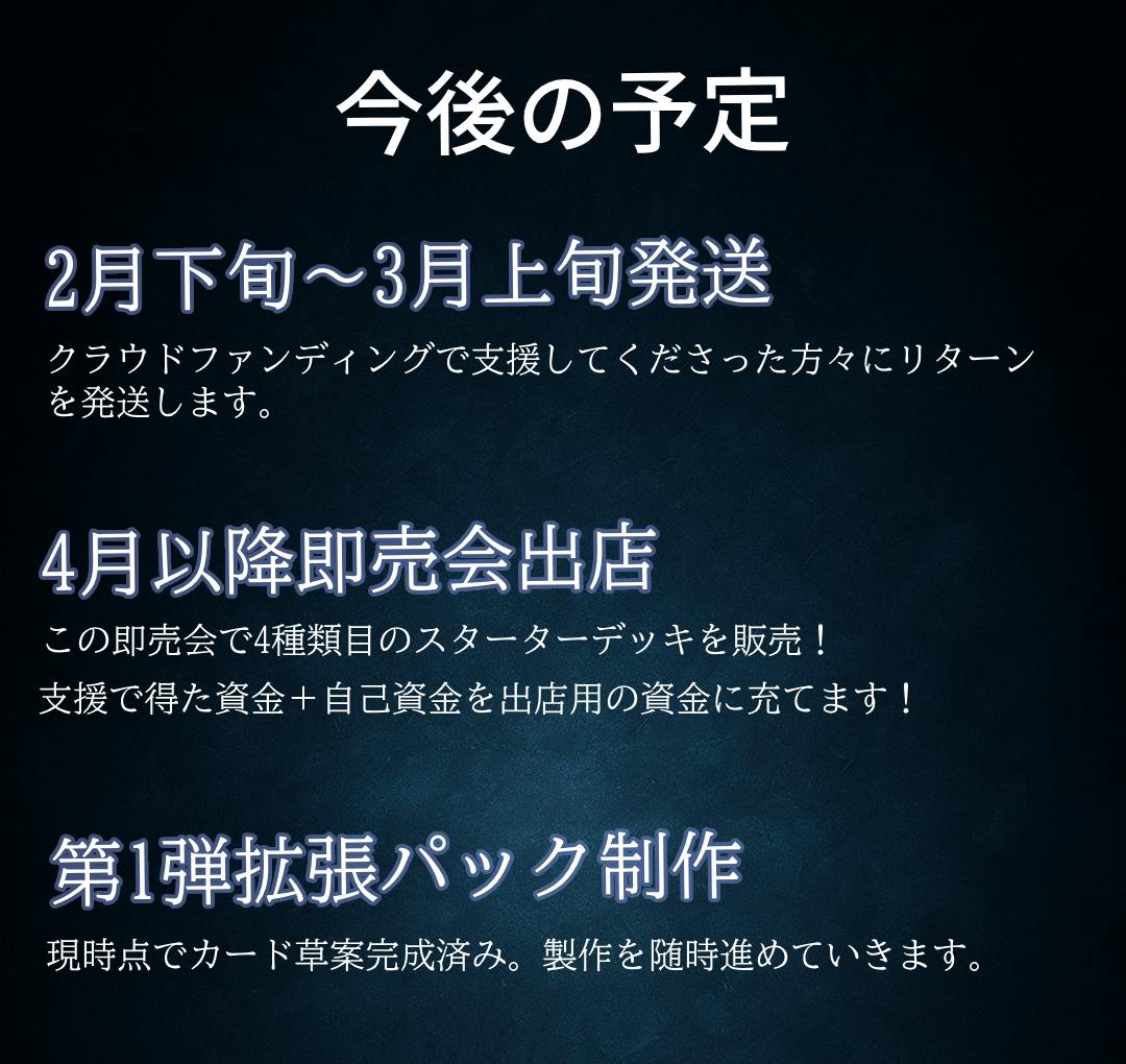 個人制作のため、これまでの開発費はすべて自己資金でまかなってきました。しかし、初回印刷や体験会開催など、さらなる展開のためには多くの費用が必要です。このクラウドファンディングでは、第1弾スターターデッキの生産資金を集め、より多くの方にこの作品を届けたいと考えています。