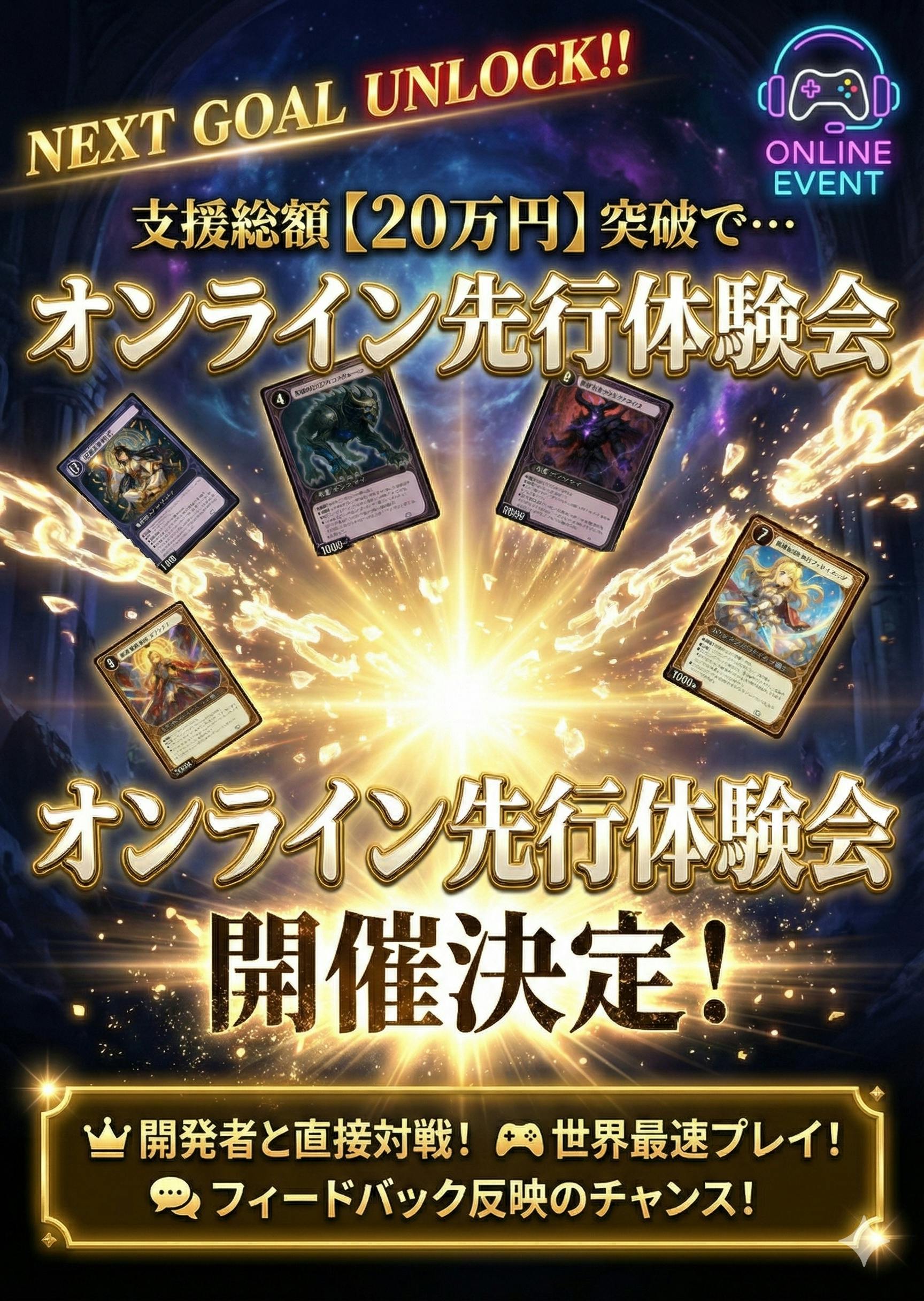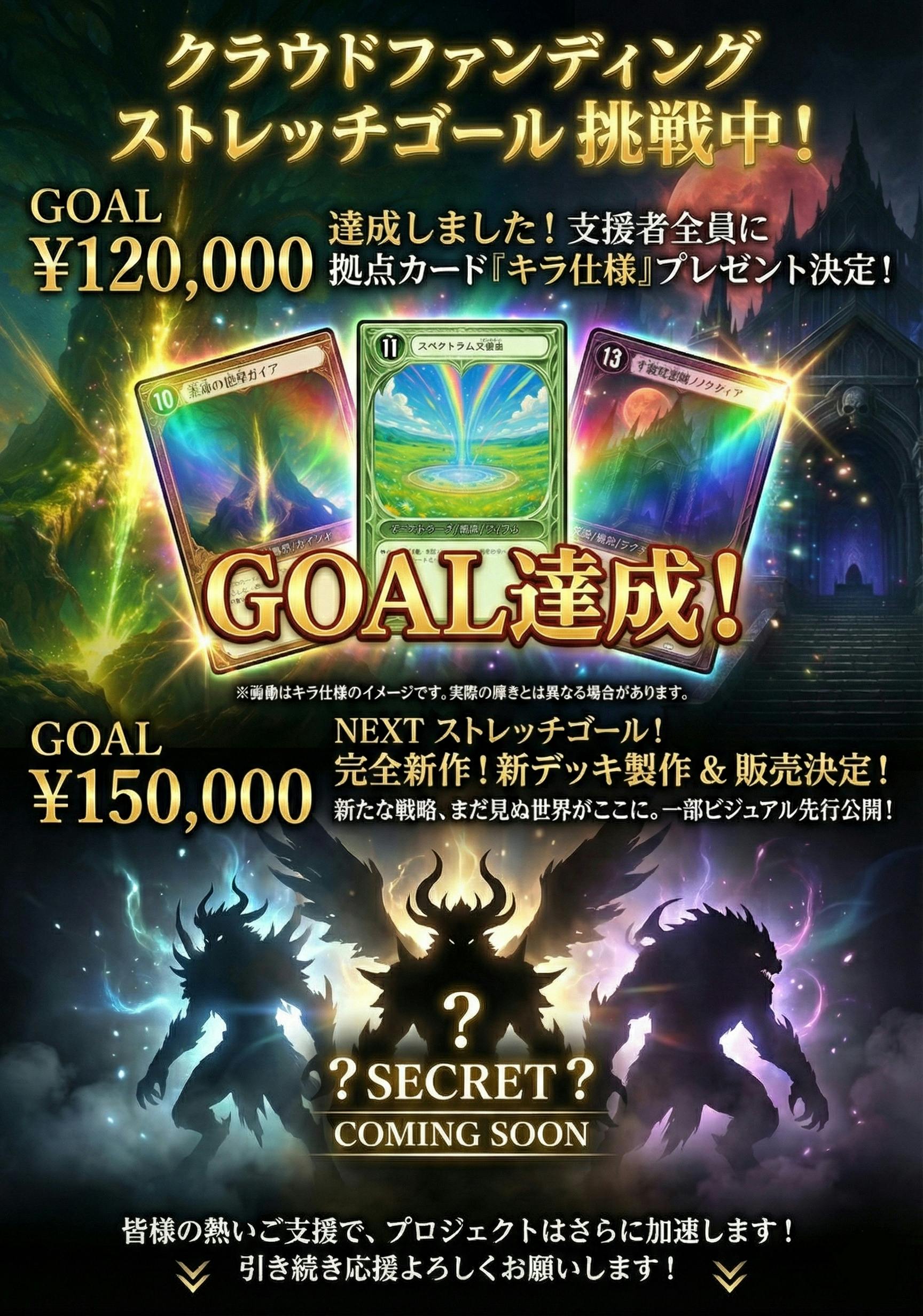 2025/12/04 10:55今、支援額が159600円を越えました。正直、ここまで来られるとは思っていなかったです。支援してくれた方、興味を持ってページを覗いてくれた方、本当にありがとうございます。このプロジェクトは「カードを作ること」が目的ではありません。遊べる世界を作ること。それが最初からのゴールでした。そこで、次のストレッチゴールを設定します。20万円達成で——公式オンライン体験会を開催します。Discordサーバーに専用チャンネルを開設ユドナリウムでのオンライン対戦会だれでも参加OK、製作者が直接レクチャー「届いたら終わり」じゃなく、届いたものを一緒に遊ぶ場所を作りたい。TCGは、箱にしまって眺めるだけのものじゃなく、誰かと対戦して初めて意味を持ちます。だからこそ、この作品を最速で遊べる環境をセットで届けたい。今はまだ、20万円という数字が遠く感じます。でもここまで来れたように、最後まで走り切れば届くかもしれない。もしこのプロジェクトを「面白そうだな」と思ってくれているなら、最後の後押しをしてくれると嬉しいです。クラファン終了まで、あと少し。最後まで走ります。 もっと見る