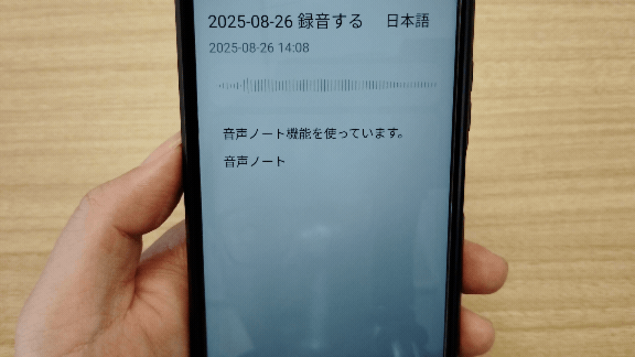 音声ノート画面からマイクボタンをタップして録音を開始すると、システムが音声を自動で認識し、内容をテキストとして表示します。