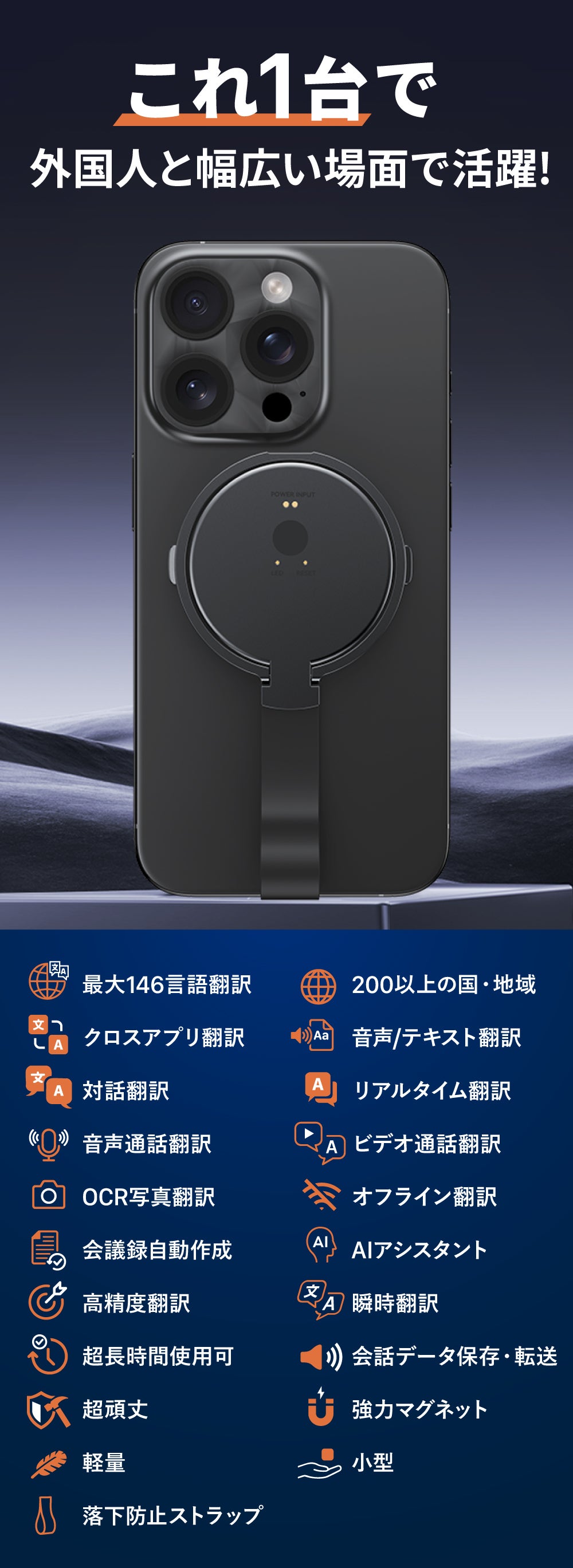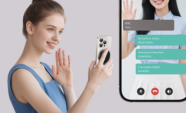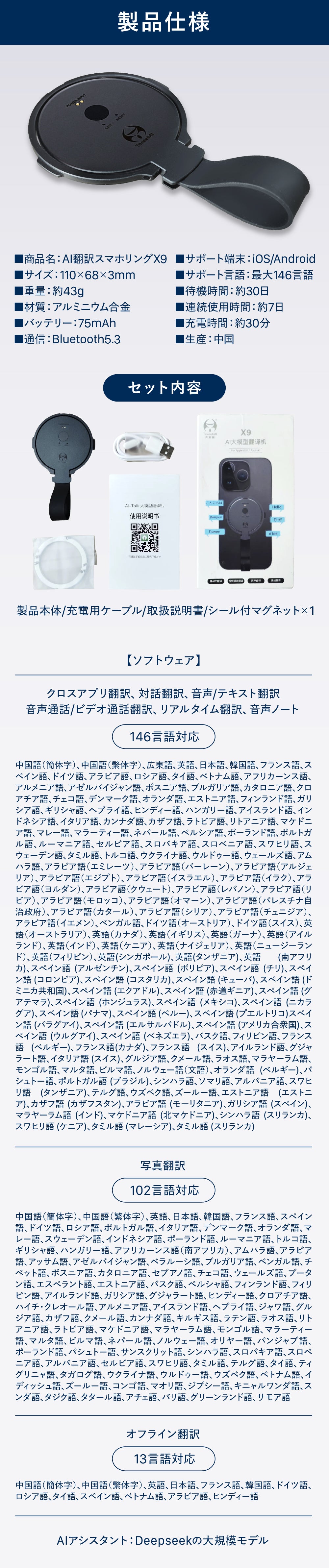 会話、チャット、ビデオ通話など、外国語が必要なさまざまなシーンでコミュニケーションをサポートするスマホリング型翻訳機、X9。