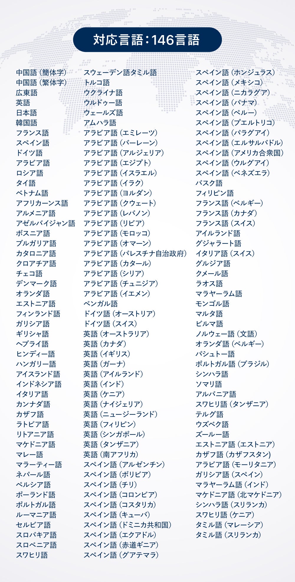 クロスアプリ翻訳モードの対応言語は146種類。独自のAI翻訳エンジンを採用しているため、高精度で自然な翻訳を実現します。