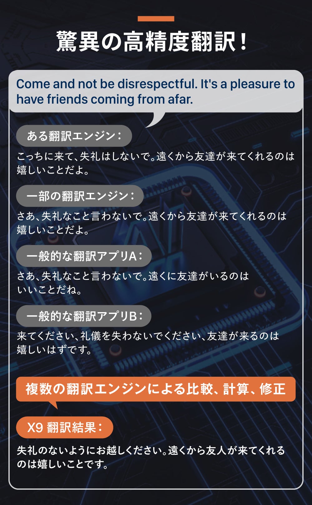 X9は、Googleをはじめとする複数の翻訳エンジンを活用し、音声やテキストを同時に解析。それぞれの翻訳結果をAIが比較・調整しながら最適な内容へと整理します。