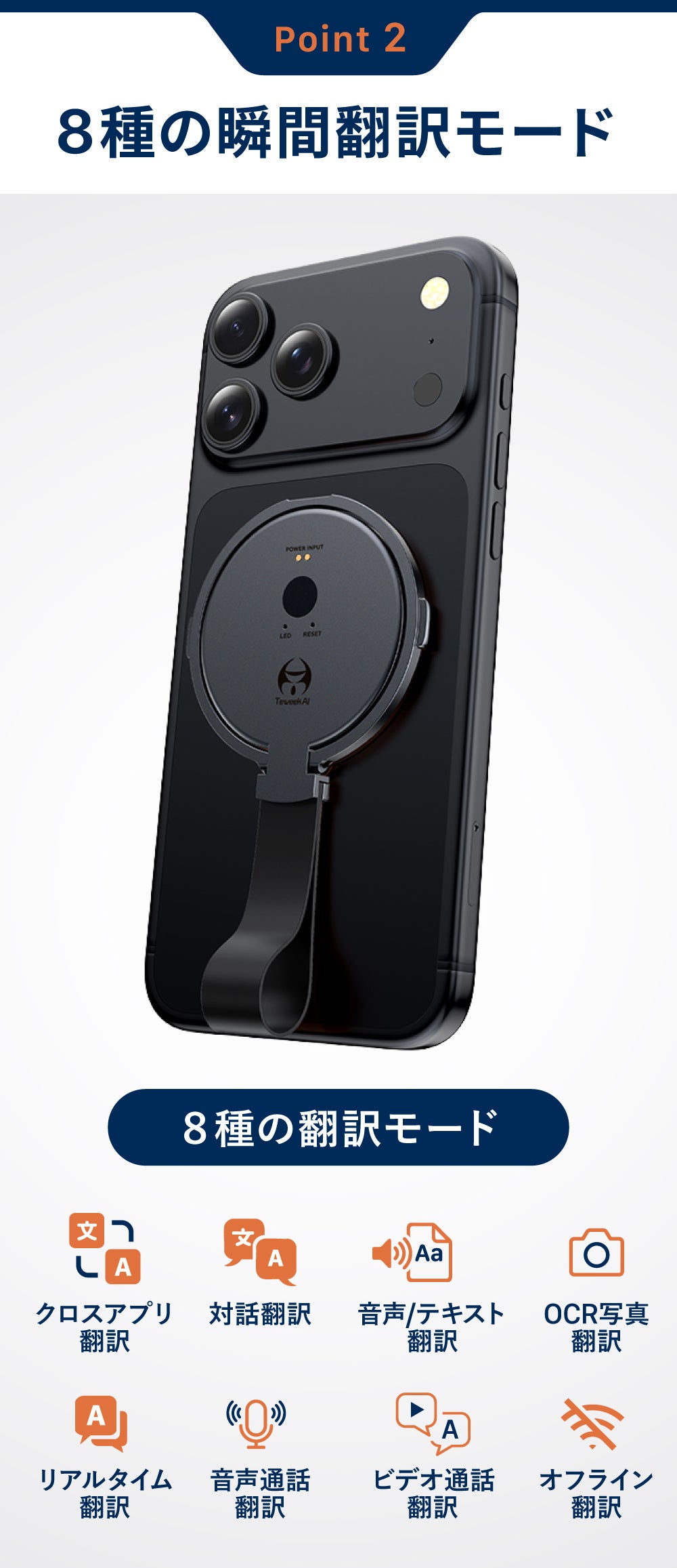 また、会話翻訳やリアルタイム通訳、OCR通訳、写真翻訳など8種の翻訳モードを搭載しているため、使いたいシーンに合わせて柔軟に活用することができます。