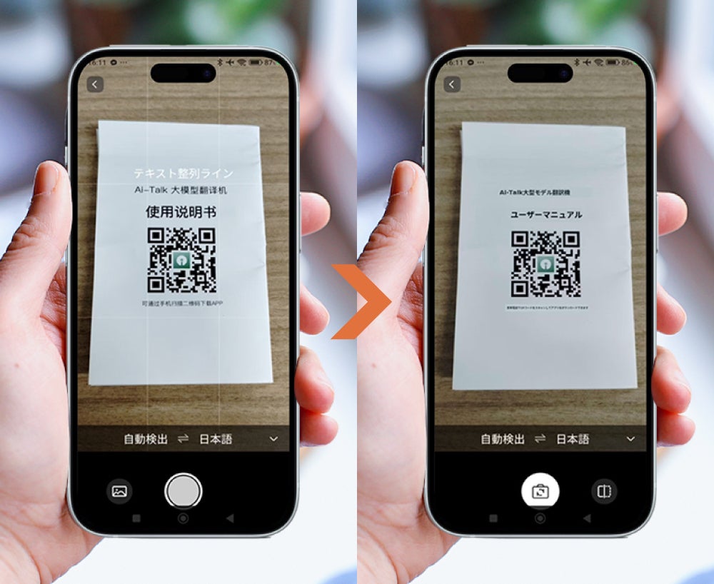 専用アプリで写真翻訳モードを選択し、自分の言語と翻訳したい言語を設定。文字が写っている対象を撮影すると、画像内のテキストを自動で認識し、翻訳結果をすぐに表示します。