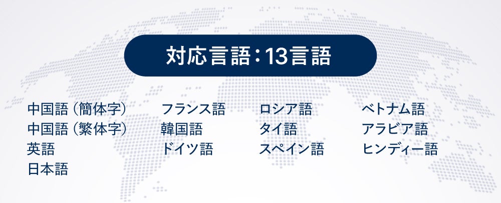 対応している言語は、中国語(簡体字・繁体字)、英語、日本語、フランス語、韓国語、ドイツ語、ロシア語、タイ語、スペイン語、ベトナム語、アラビア語、ヒンディー語の計13種類。