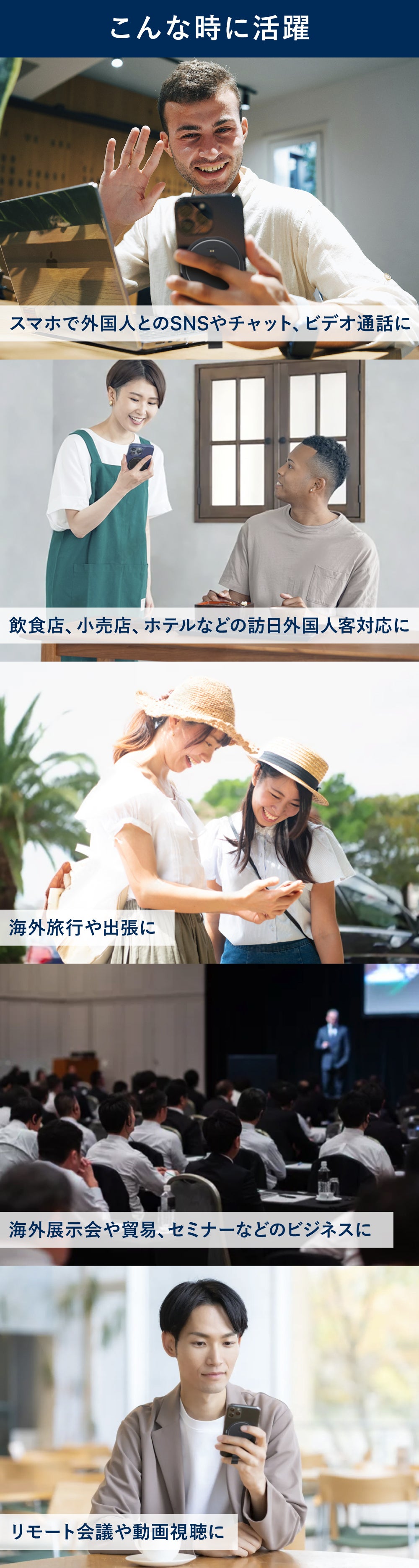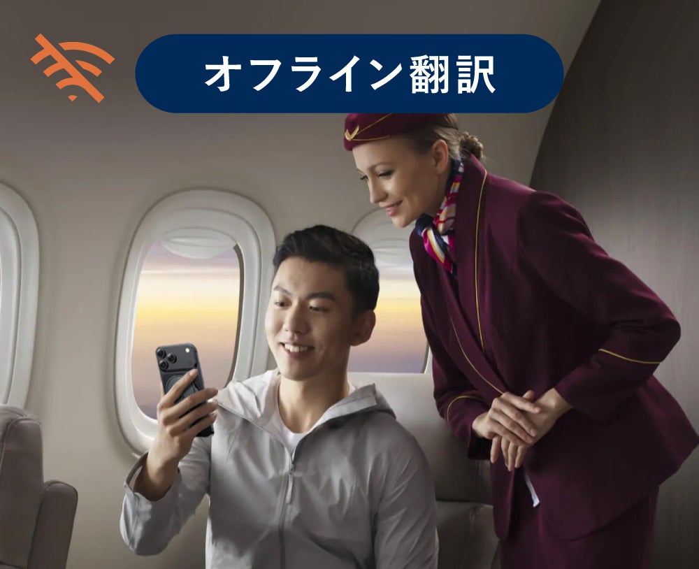 国連公用語の多くをカバーしており、インターネットが使えない飛行機の機内や、通信環境が整っていない海外のホテル、観光地などでも活用可能。機内食の注文や現地スタッフとの簡単な会話など、多様な場面で役立ちます。