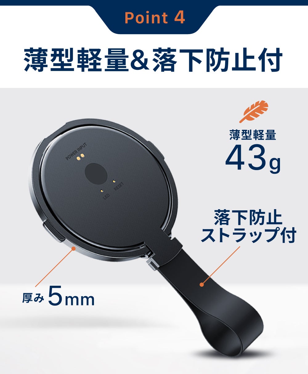 その重量は平均サイズの卵1個分よりも軽く、厚みも5mmほどしかないので、ポケットやカバンに入れても邪魔になりません。
