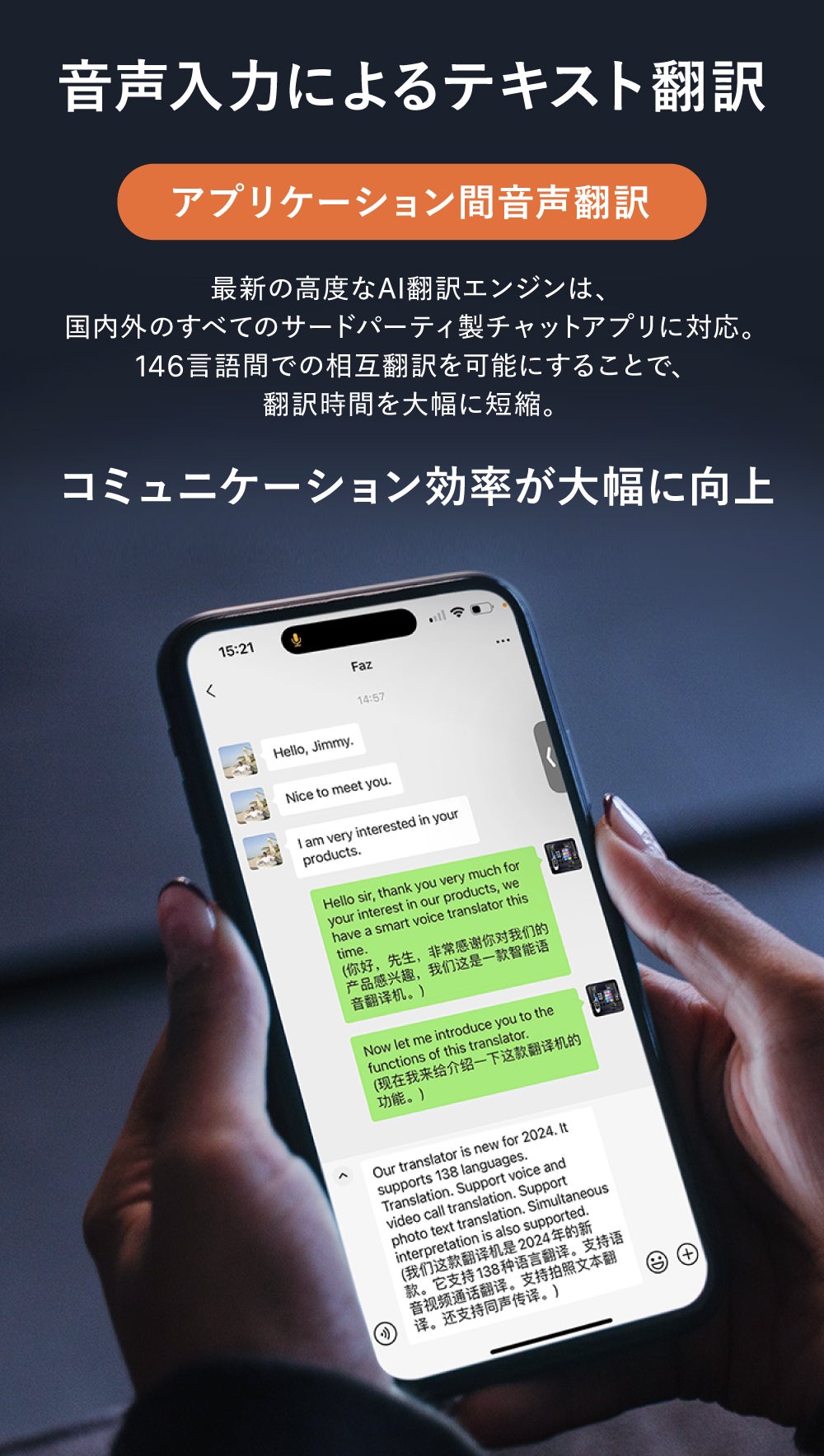 クロスアプリ翻訳モードを使えば、話した母国語の内容がその場で翻訳され、SNSチャットのメッセージとして自動入力されます。