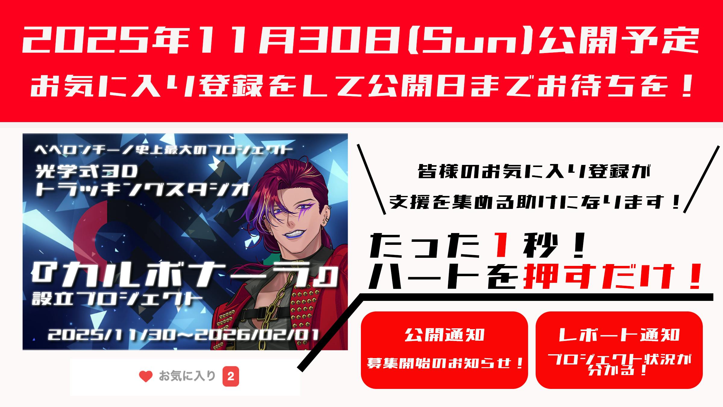 この度、株式会社ペペロンチーノは新規事業プロジェクトとして、光学式3Dトラッキングスタジオ「カルボナーラ」を2026年内に建設するためのクラウドファンディングを行います。