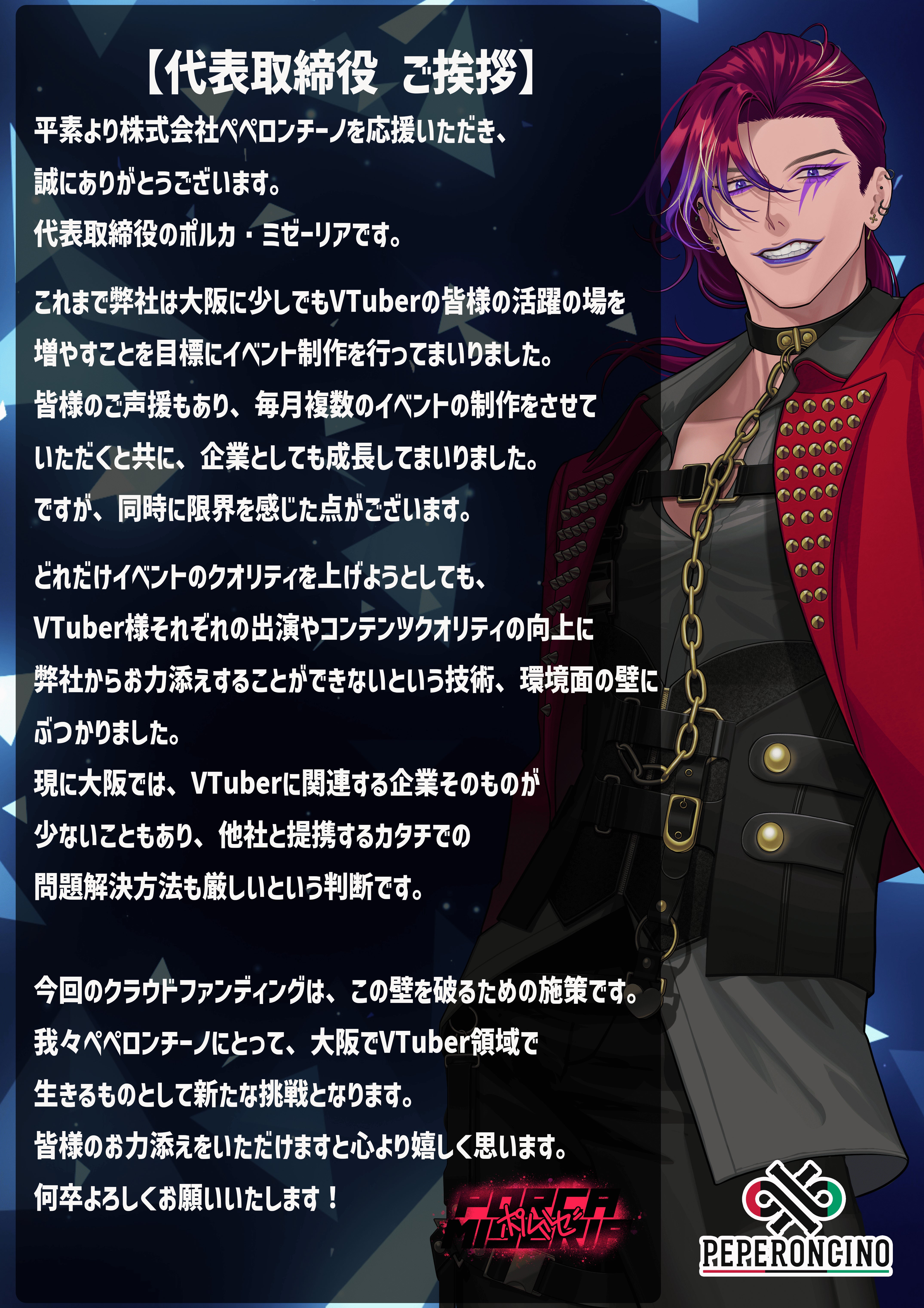 その後、出身地である大阪をVTuberの皆と盛り上げたいという思いからイベント団体「ペペロンチーノ」を設立。1企業経営者として、1人のVTuberとして、今以上に大阪が面白くするために動いている。