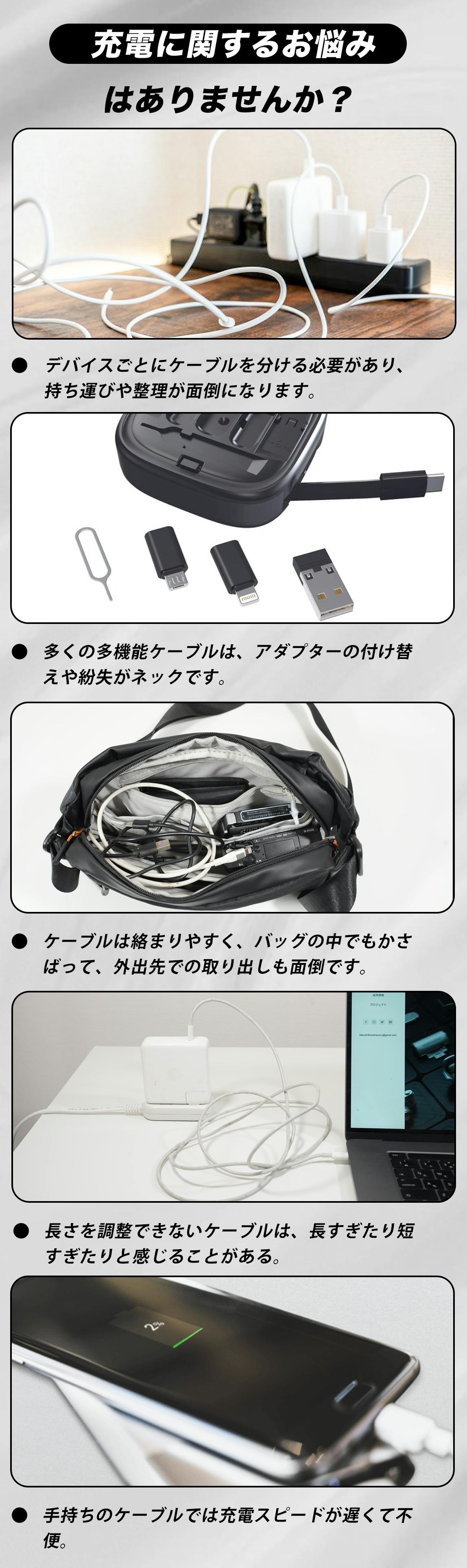 「充電を、もっと自由に。」 という想いのもと、どこへでも持ち運べる、ファッションにも馴染む、そして一つで多くのデバイスに対応できる充電アイテムを生み出しました。