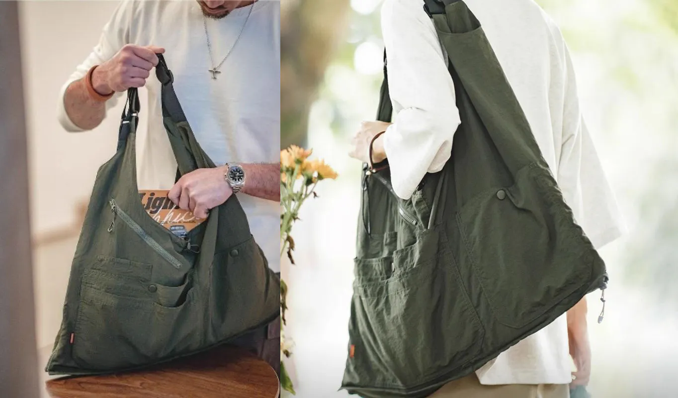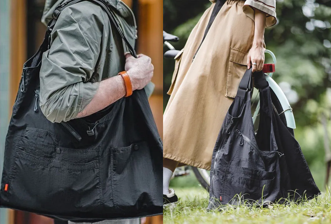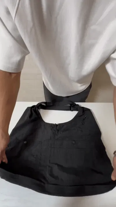 ・バッグ形態:肩に掛けるだけで大容量バッグに変身。用途に合わせて瞬時に切り替え可能。出かける時も、帰る時も、これ一枚で完結します。