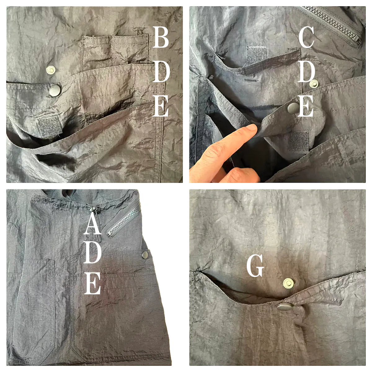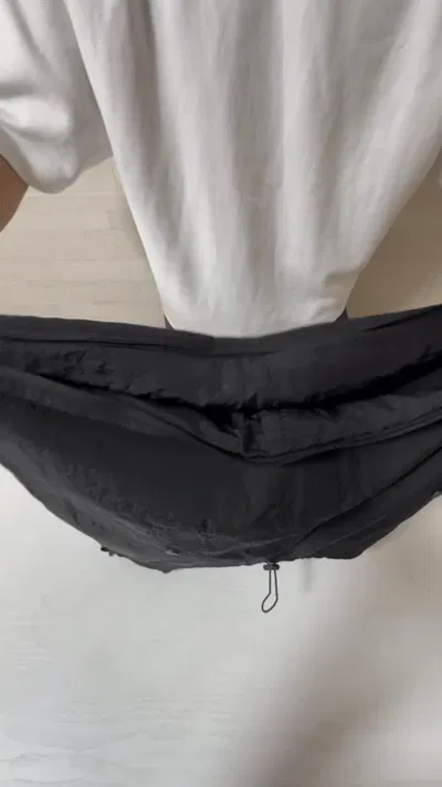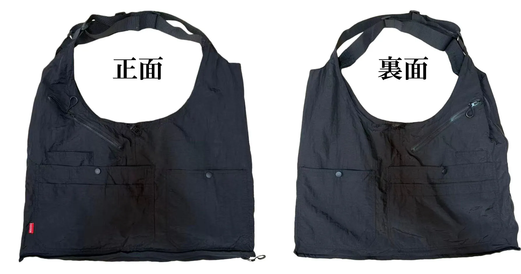 最初はエコバッグを服に縫い付けたような試作品からスタート。試行錯誤の末、・“着て使う”時のシルエットの美しさ・“バッグに戻す”時の簡単さ・男女どちらにも似合うバランスこの3点を両立させる構造にたどり着きました。
