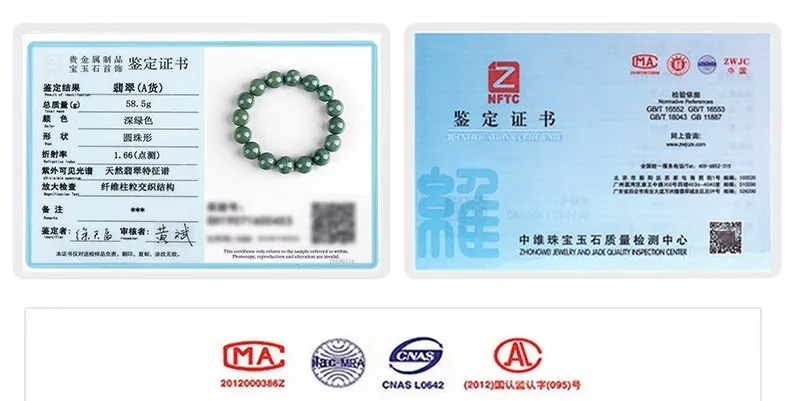 「本翡翠ブレスレットは、中国国家級機関『中維珠宝玉石品質検験中心(Zhongwei Jewelry and Jade Quality Inspection Center)』にて検査・認定されたA貨翡翠です。
