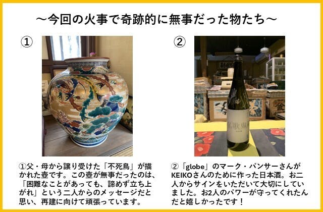 店の裏側から燃えていったため、何とか看板だけはその形を残すことが出来ましたが、商品や家財道具だけでなく、数十年分のお取引先の電話番号などを記録した顧客台帳も焼けてしまいました。スマホに残る火災当時の写真を見ると、燃えていく店のにおいや、火の熱さを思い出し、大切な店を失った現実に、今でも胸が苦しくなります。