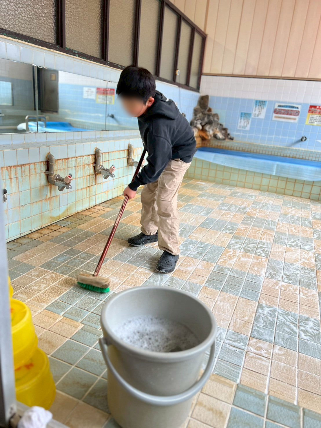 中の温度が80度にまるまで何度か薪を追加しながら、合間を縫って掃除開始。排水溝、玄関、脱衣場、脱衣箱、トイレ、浴場の桶、椅子…と掃除する箇所は多く、学校が休みの日には子供もお手伝い。