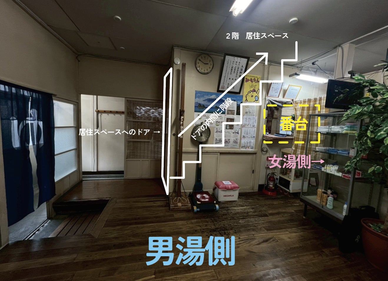 2階の自宅への入り口階段が男湯側にあるので、トイレや休憩所と勘違いしたお客さんが登って来て、驚くこともありました。