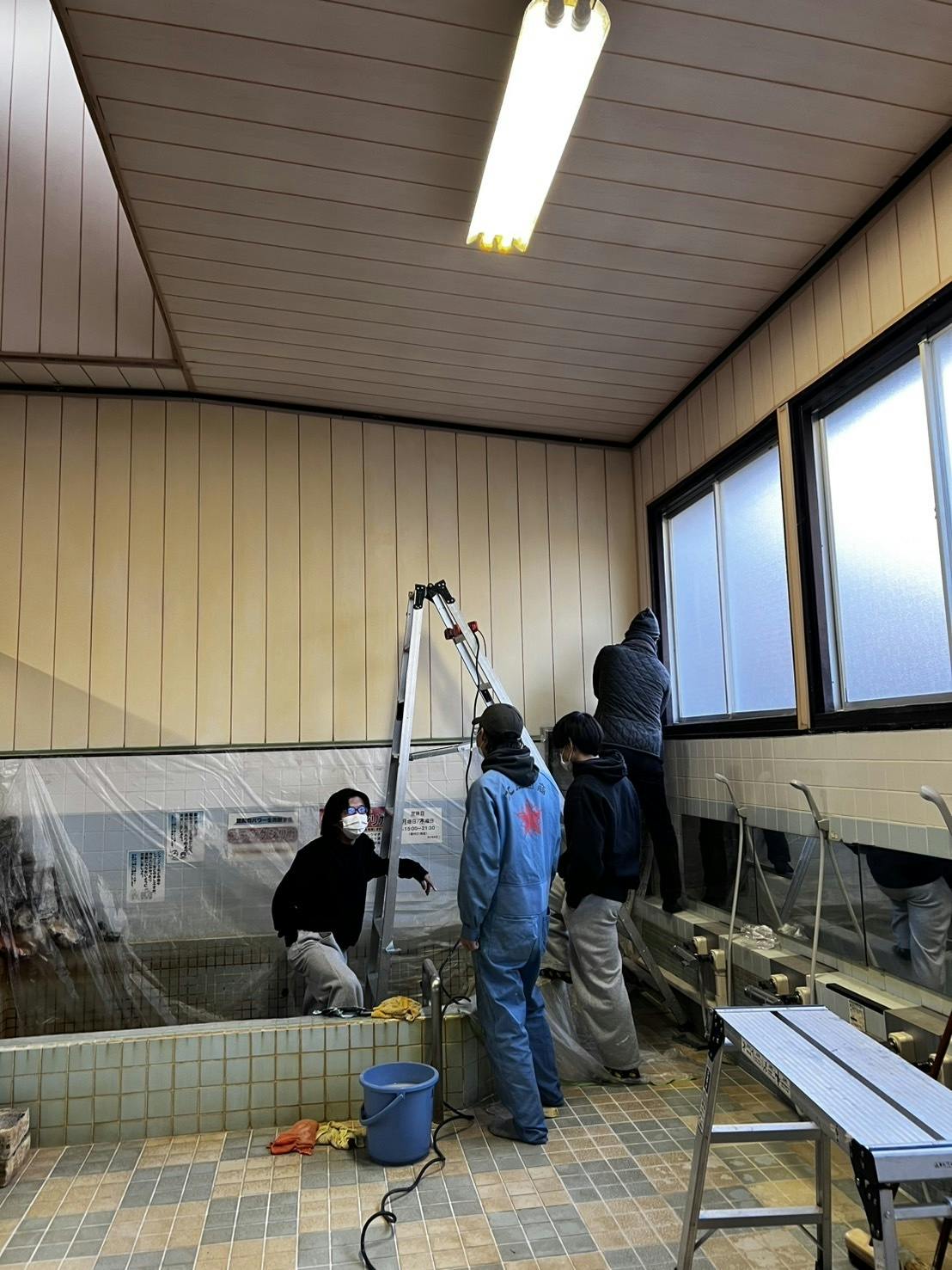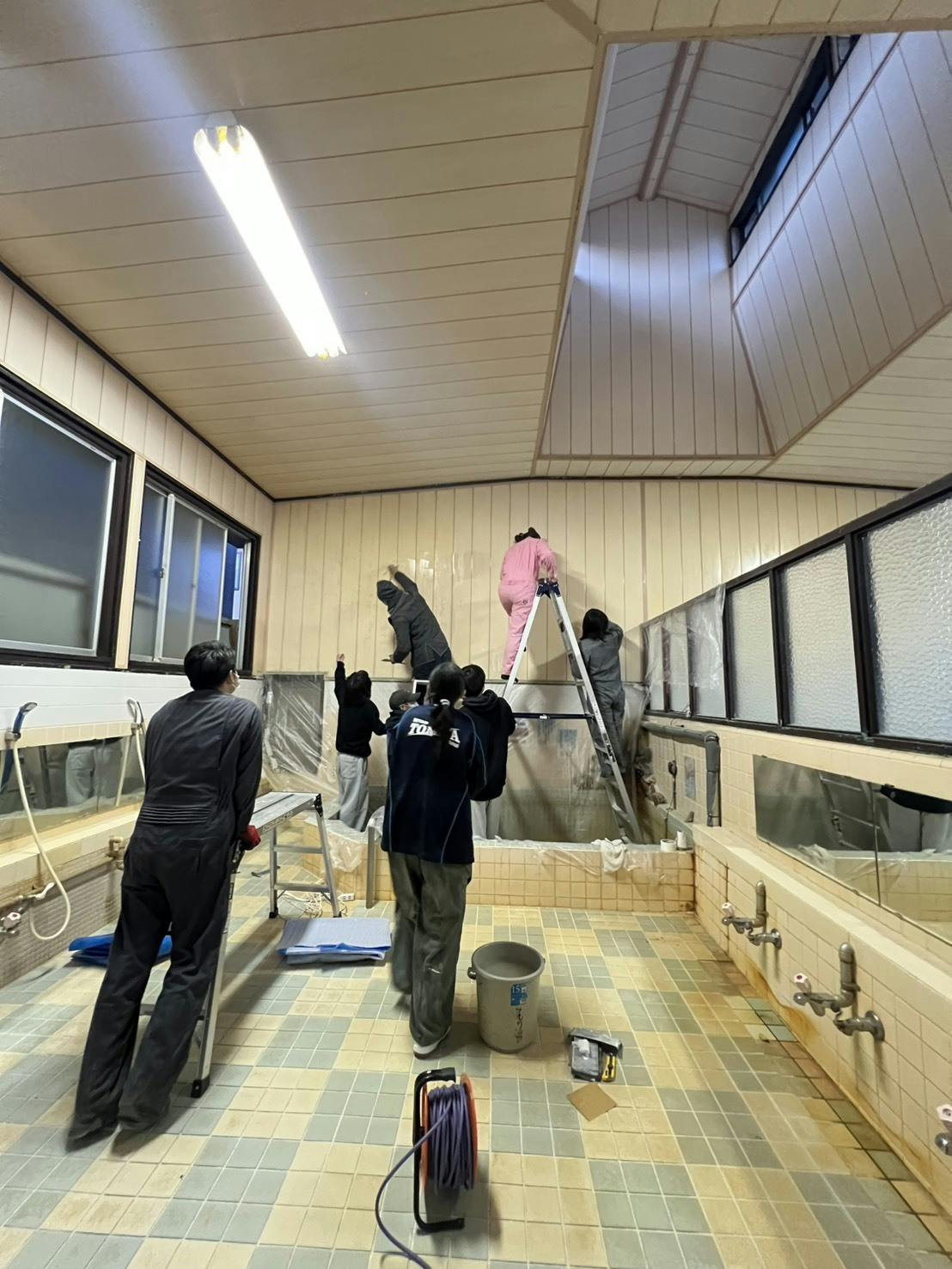 本日は、東北芸術工科大学の青山ひろゆき先生、細川貴司先生、そして生徒さんが、ペンキ絵制作のための下塗り作業をしに来てくれました!