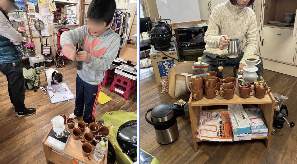 小4の息子。コーヒー豆をミルで手挽き。来てくれたみんなにコーヒーやお茶のお振る舞い