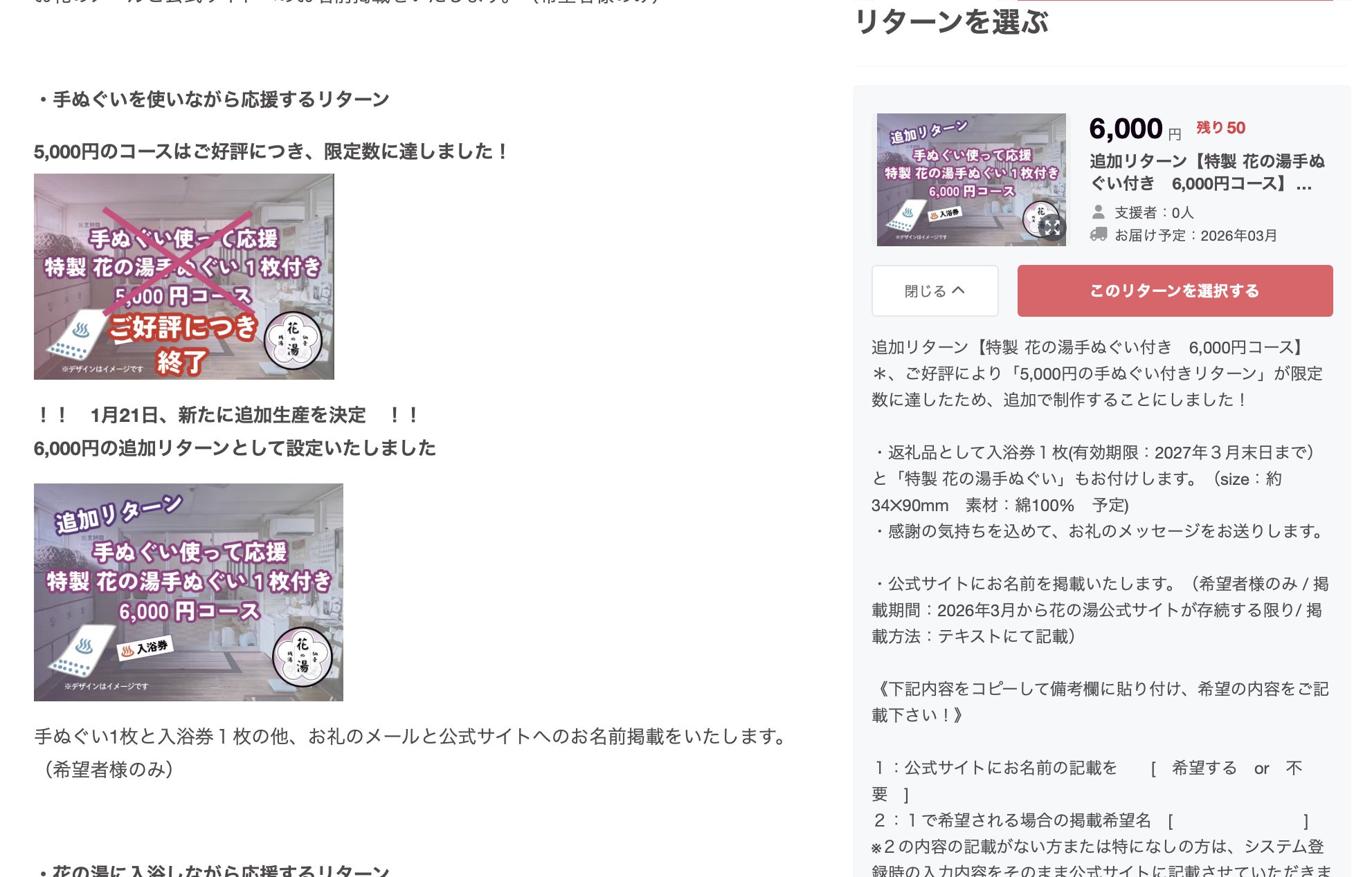 お陰様で、限定数50で設定していた手ぬぐい付きリターン5,000円が在庫切れに!!