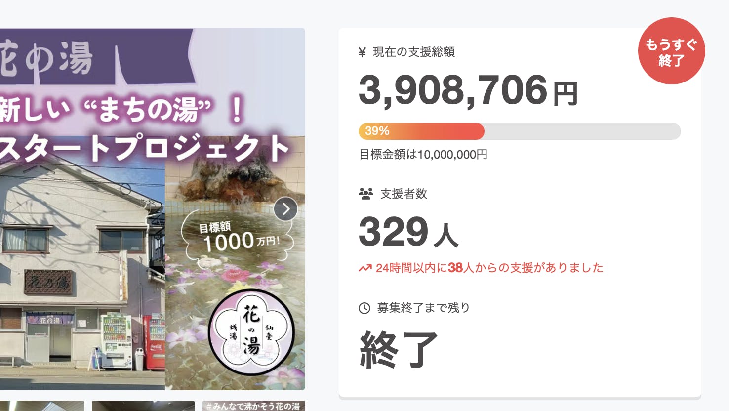 残念ながら目標金額1000万という大きな山は登りきることが出来ませんでしたが、花の湯の再開を目指し、一日も早く皆様にお湯に入って頂けるように引き続き頑張ってまいります!
