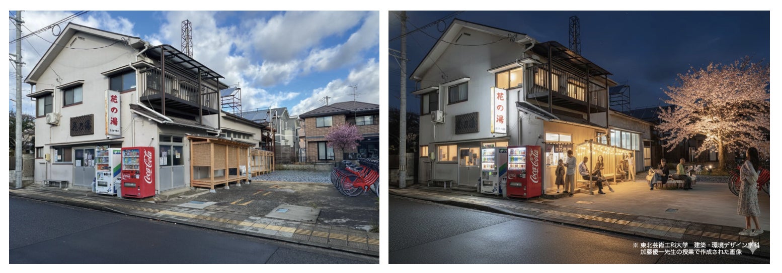 東北芸術工科大学の建築・環境デザイン学部 加藤優一先生のご協力のもと、これまで駐車場として使用していたスペースを銭湯の縁側というコミュニティスペースに再生するプロジェクトです。