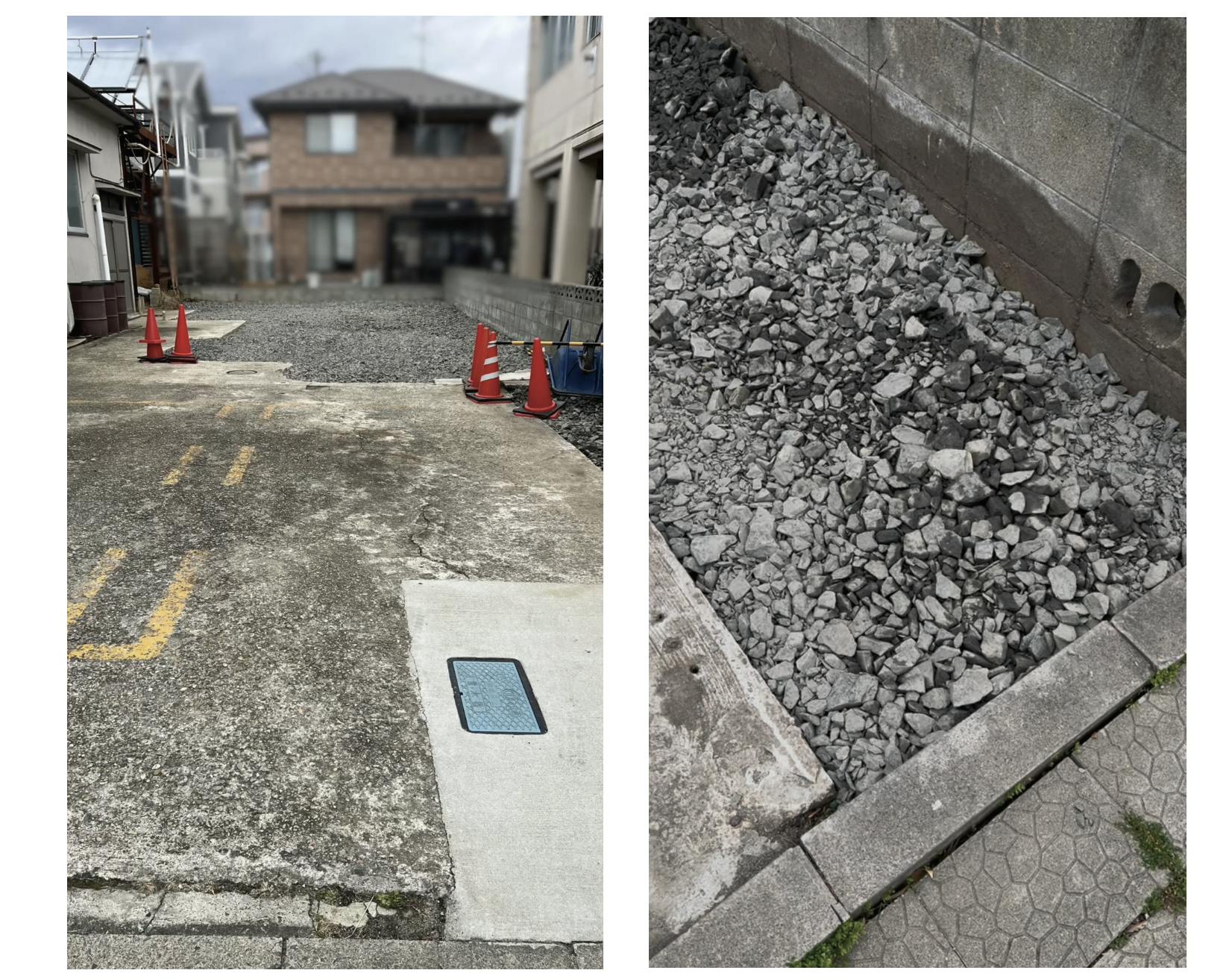 画像のように敷地の奥や脇の花壇だった場所まで砂利が敷き詰められました。