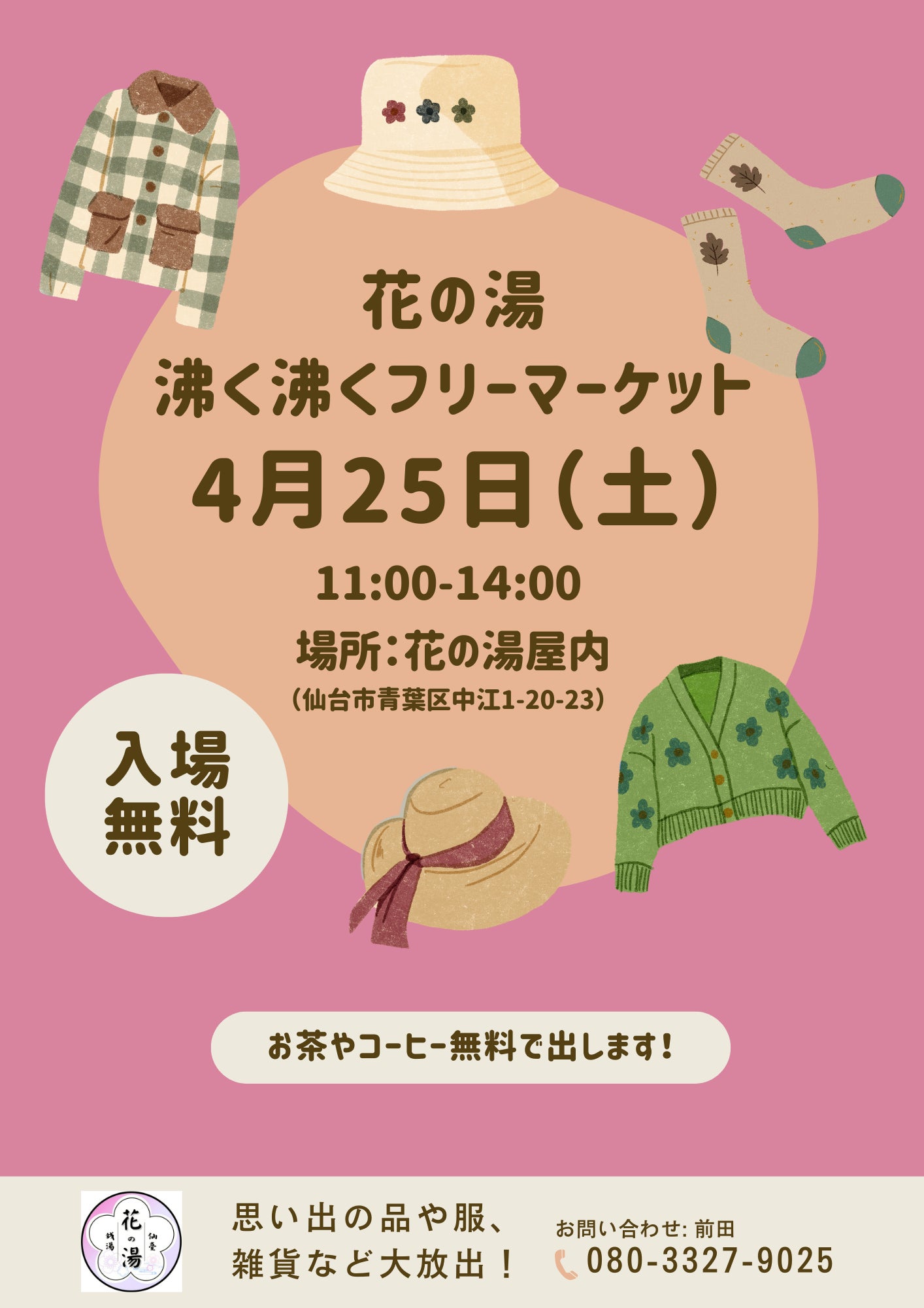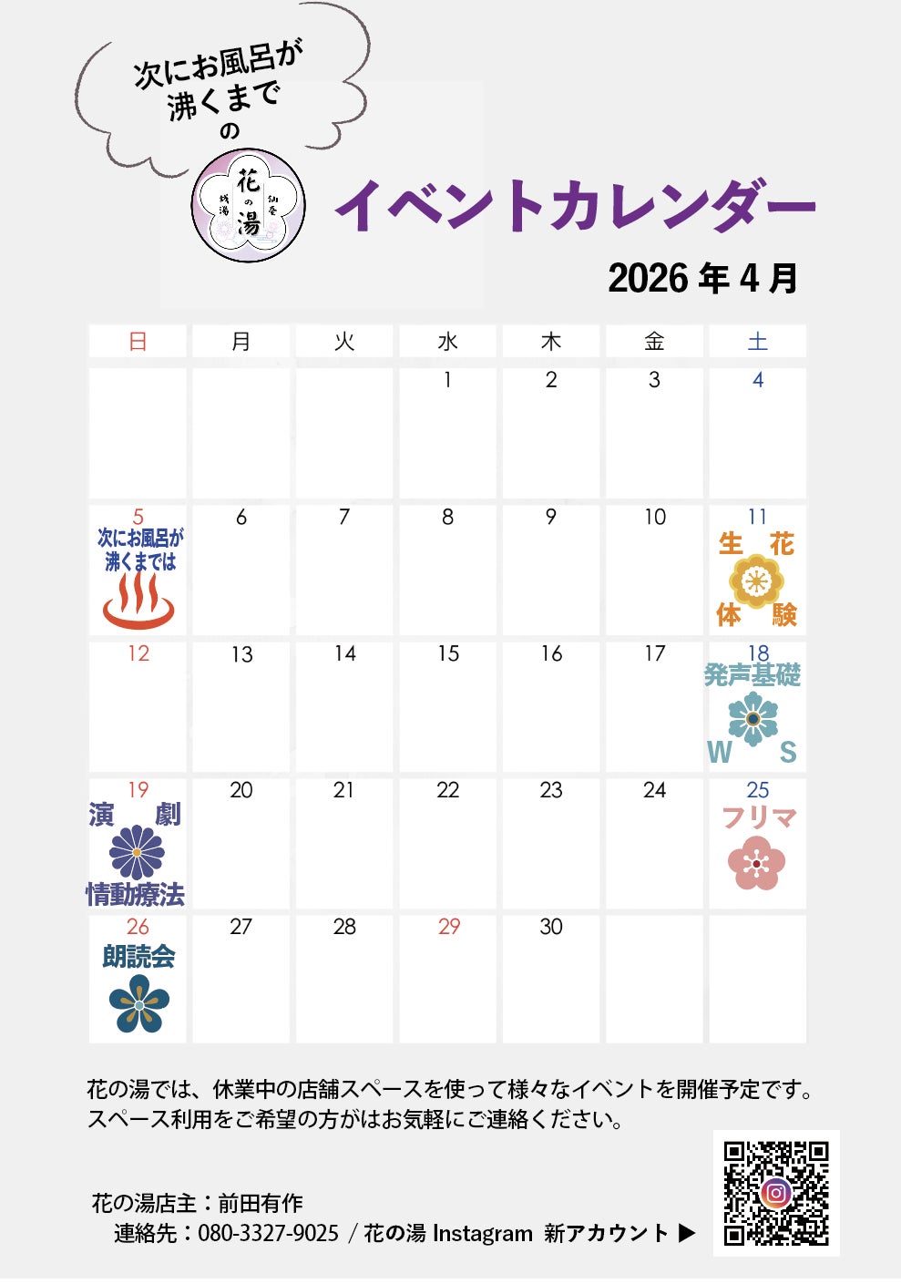 その他、休業中の花の湯で何かチャレンジしてみたい!という方は是非お気軽にご連絡下さい。浴場内、脱衣スペース、となりの敷地などご利用いただけます。