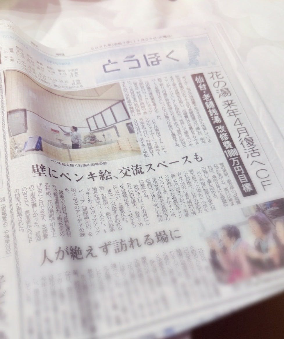 2025/11/26 09:4711月15日に開催したクラウドファンディングスタートのキックオフイベント、「次にお風呂が沸くまでは」Vol.1に取材に来てくださった河北新報さんが、11月25日の朝刊に今回の取組について掲載してくださいました。カラーの部分に大きなスペースで取り上げていただいておりまして、本当にありがとうございます!!この記事を見たという方から早速ご支援もいただいていて、とても嬉しいです。河北新報を購読されていないという方も、オンライン記事で読むことが出来ますのでよろしければこちらからどうぞ!(無料会員登録をすると、1日1記事が読めます)https://kahoku.news/articles/20251124khn000018.htmlこの日11月15日には記事の内容や写真にもあるように、常連の奥様方に応援に駆けつけていただき、さらにその場で現金での支援をも頂いてしまいました。花の湯のことを想い応援をしてくれる皆様がいる事、そういった方々に支えられて87年営業をしてこれた事を再確認し、このプロジェクトへの熱意が一層高まりました!(現金で頂いた支援は、代理支援という形でプロジェクトに反映させて頂く予定です。現在手続きを進めております)#みんなで沸かそう花の湯このハッシュタグを合言葉にして、引き続き皆様の想いと一緒に頑張ります!是非、プロジェクトのSNSでのシェアや、お友だちや職場の方との雑談の際に話題の一つにしてもらえたらと思います。多くの方に、この挑戦を知ってもらえるように、どうぞよろしくお願いいたします。 もっと見る