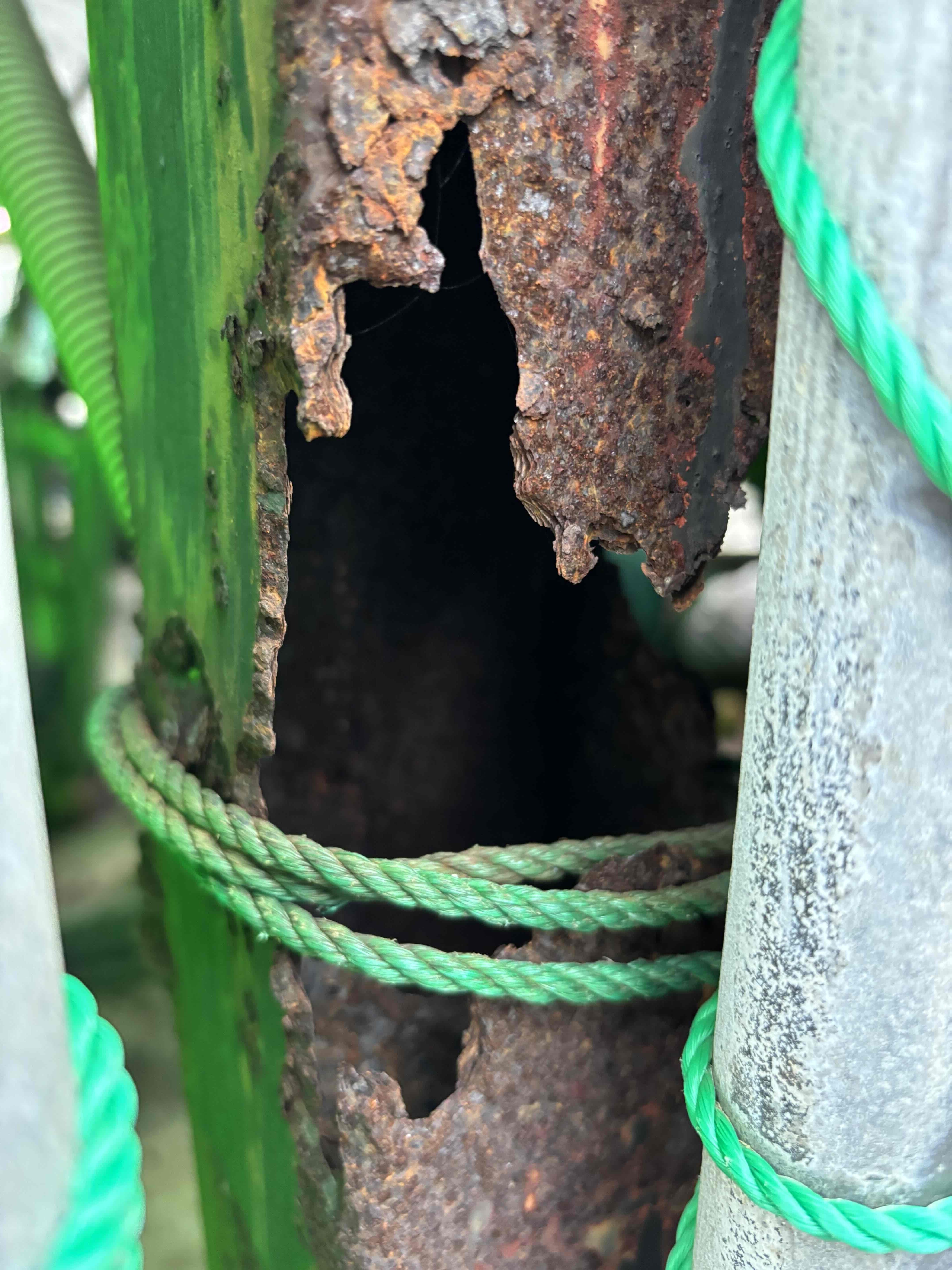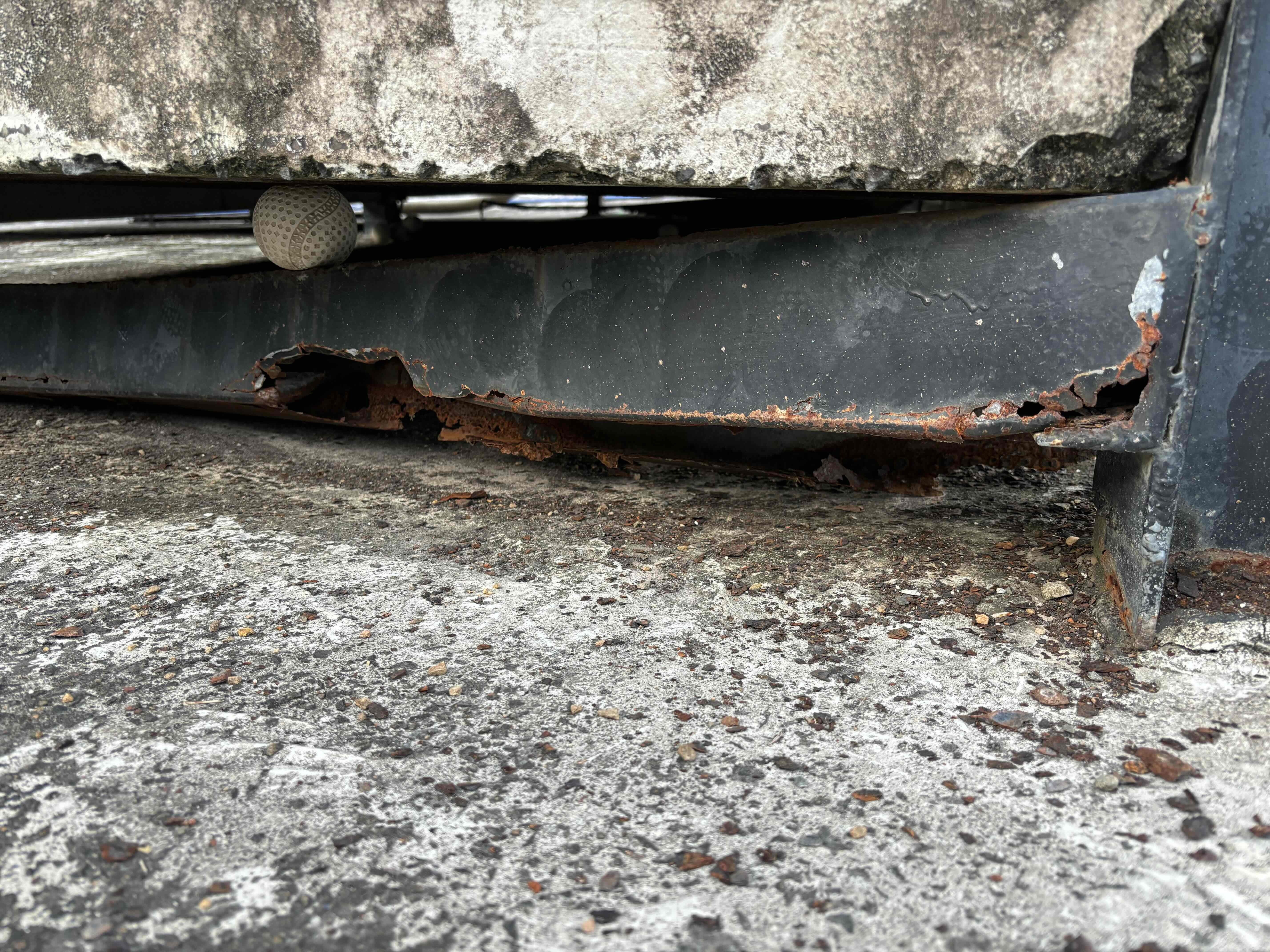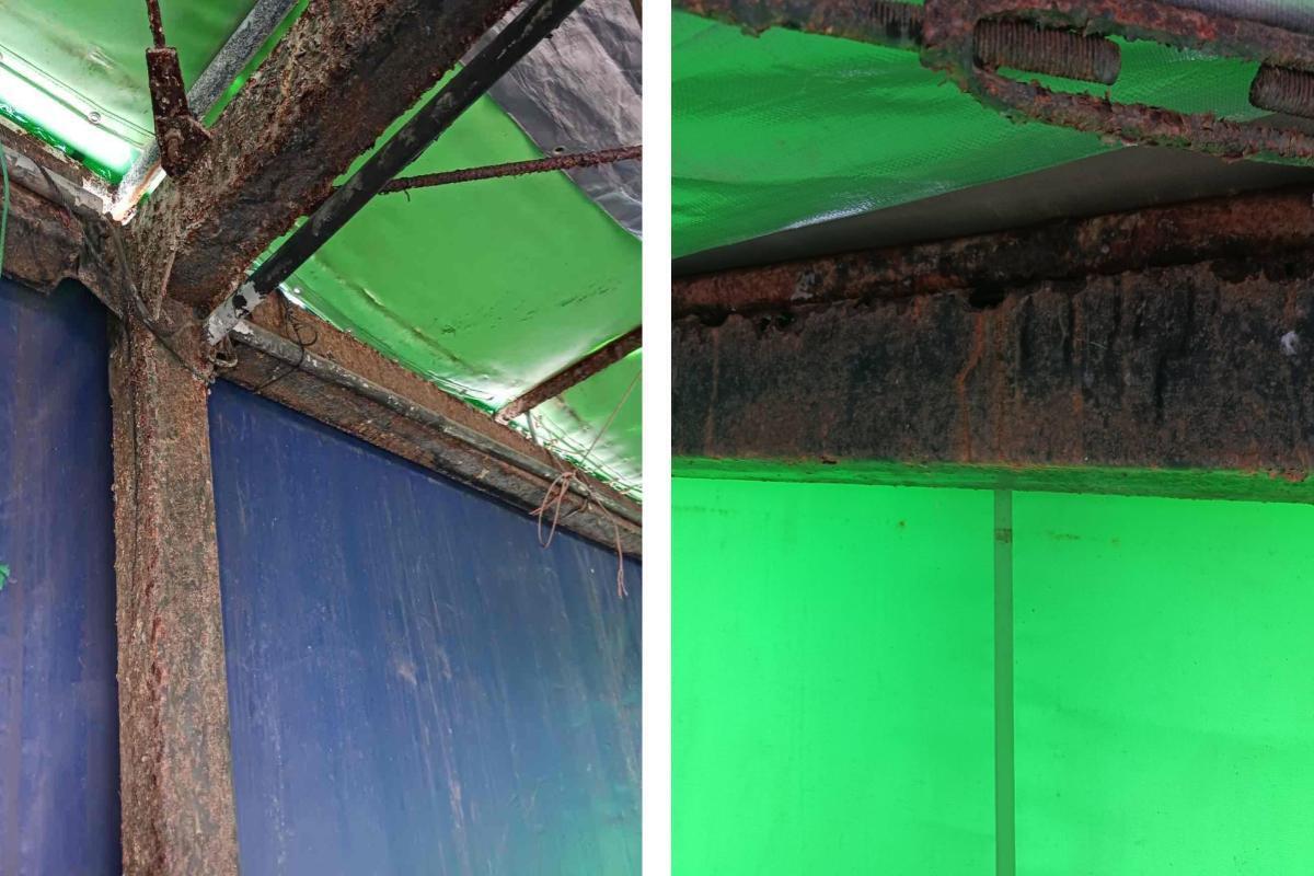 腐食によりマシン室の下の鉄骨が崩れ落ち始めている