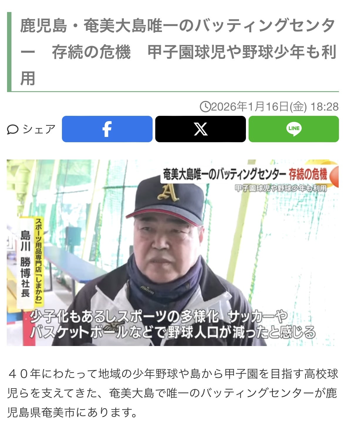 2026/01/17 11:20昨日、KTS鹿児島テレビさんがバッティングセンターしまかわのクラウドファンディング挑戦を取り上げて下さいました。ご協力していただき、心より感謝致します。クラウドファンディング挑戦残り8日!!昨日も日本全国からたくさんのご支援をいただき、心より感謝申し上げます。KTS鹿児島放送↑バッティングセンターしまかわクラウドファンディング挑戦こちらから視聴できます。 もっと見る