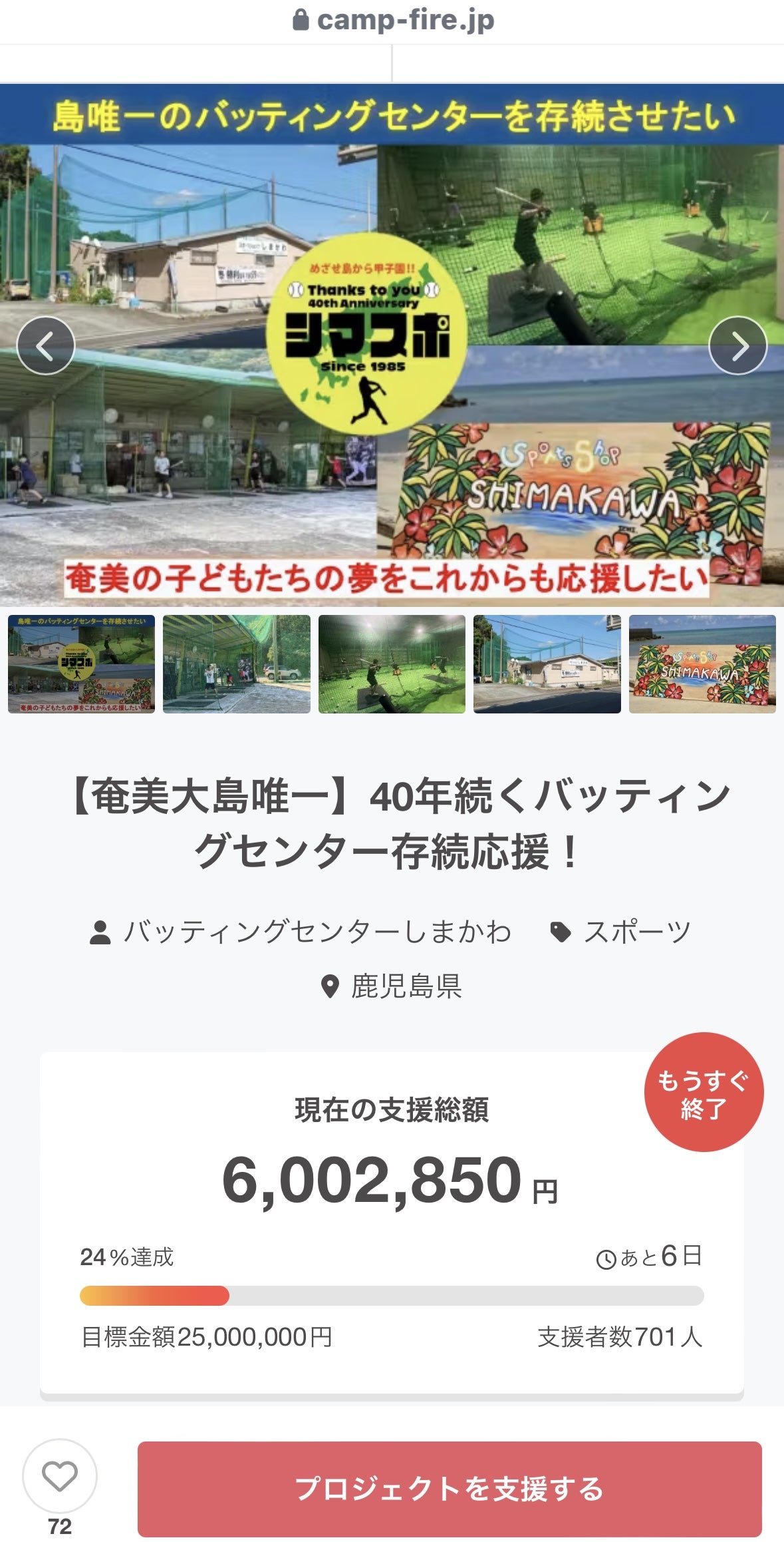 2026/01/19 12:08お世話になっております。日本全国からたくさんの温かいご支援・ご協力、応援をしていただき、誠にありがとうございます。先ほど、ご支援者様が700名を超え、600万円を突破することができました。こんなにもたくさんご支援をしていただき、島川家一同、心より感謝しております。今回のクラウドファンディング挑戦期間も残り1週間を切りました!!現在、7台あるマシンのうち2台が使用不可。1台(No.3マシン)は、日々故障の繰り返しで、寿命がきているためギリギリの状態で稼働。残りの4台のマシンは修理が必要な状態となっております。奄美大島にはマシンの業者がないため、修理も自分たちでできる範囲のメンテナンス程度しかできず、日々マシンの不具合の繰り返しで、お客様にご迷惑をおかけしている状態です。今回の挑戦でなんとか1台でも多くマシンをリニューアルし、他マシンも修理ができれば、もっともっとお客様の技術向上のお役に立てたり、楽しんでもらえると思います。皆さんからの支援金は、バッティングセンターのリニューアルのための改修工事費用とプロジェクトの活動資金に使わせていただきます。○マシン室 300万円(鉄骨・テント・防球ネット) ○バッティングマシン 700万円(新しいマシン3台・マシン修理4台)○ホームラン板設置 50万円○マシン室電気 50万円○打撃室鉄骨ペンキ塗装 100万円○硬式練習場設備・運営費 600万円○手数料17%+税 467.5万円○返礼品・送料 232.5万円目標金額合計2,500万円もし支援金が多く集まった時は、○硬式練習場使用料負担軽減○マシン修理4台を新しいマシンへ変更 800万円○コン柱取替工事(11本) 500万円○排水工事 50万円に充てさせていただきたいと考えています。残り1週間、奄美の子どもたちの夢と未来を応援するために、1人でも多くの方にこのプロジェクトを知っていただけますように、皆さまのお力を貸して下さい。どうかご協力を宜しくお願い致します。 もっと見る感謝致します!