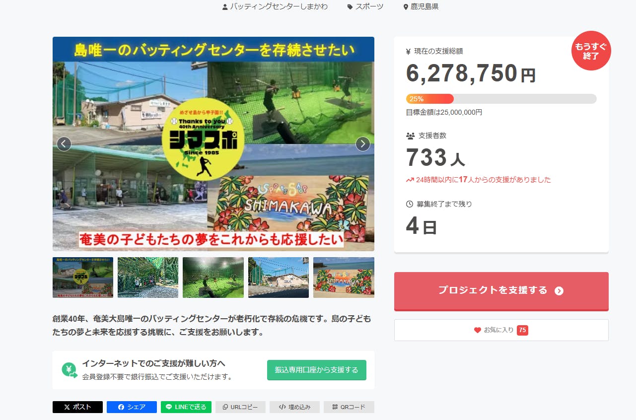 2026/01/19 12:08お世話になっております。日本全国からたくさんの温かいご支援・ご協力、応援をしていただき、誠にありがとうございます。先ほど、ご支援者様が700名を超え、600万円を突破することができました。こんなにもたくさんご支援をしていただき、島川家一同、心より感謝しております。今回のクラウドファンディング挑戦期間も残り1週間を切りました!!現在、7台あるマシンのうち2台が使用不可。1台(No.3マシン)は、日々故障の繰り返しで、寿命がきているためギリギリの状態で稼働。残りの4台のマシンは修理が必要な状態となっております。奄美大島にはマシンの業者がないため、修理も自分たちでできる範囲のメンテナンス程度しかできず、日々マシンの不具合の繰り返しで、お客様にご迷惑をおかけしている状態です。今回の挑戦でなんとか1台でも多くマシンをリニューアルし、他マシンも修理ができれば、もっともっとお客様の技術向上のお役に立てたり、楽しんでもらえると思います。皆さんからの支援金は、バッティングセンターのリニューアルのための改修工事費用とプロジェクトの活動資金に使わせていただきます。○マシン室 300万円(鉄骨・テント・防球ネット) ○バッティングマシン 700万円(新しいマシン3台・マシン修理4台)○ホームラン板設置 50万円○マシン室電気 50万円○打撃室鉄骨ペンキ塗装 100万円○硬式練習場設備・運営費 600万円○手数料17%+税 467.5万円○返礼品・送料 232.5万円目標金額合計2,500万円もし支援金が多く集まった時は、○硬式練習場使用料負担軽減○マシン修理4台を新しいマシンへ変更 800万円○コン柱取替工事(11本) 500万円○排水工事 50万円に充てさせていただきたいと考えています。残り1週間、奄美の子どもたちの夢と未来を応援するために、1人でも多くの方にこのプロジェクトを知っていただけますように、皆さまのお力を貸して下さい。どうかご協力を宜しくお願い致します。 もっと見る感謝致します!