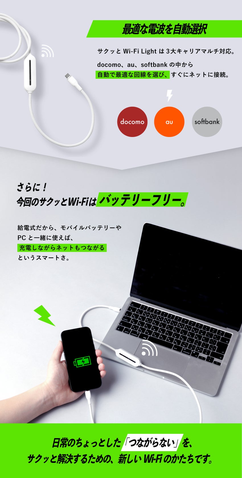 月額契約も、複雑な設定も、いりません。重たいルーターも、充電の手間も、ありません。