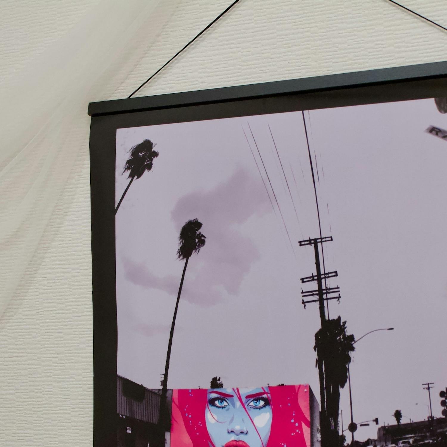 もしこの写真がだれかのお部屋にかざられるとしたら、だ。ホコリっぽいでかいガレージ。ポスターの巻きグセにたまったほこりで「そろそろ掃除しなきゃ」と思い出す。せまいワンルームの通路部分、も良い。そこをとおるたびに服とすれて、だんだんヤレてきたり。トイレに座った時の目の前、も良い。新しい発見をえられたり、湿気で紙がヨレてきたり。The dust that has accumulated around the poster's curl reminds me that it's time to clean it up.