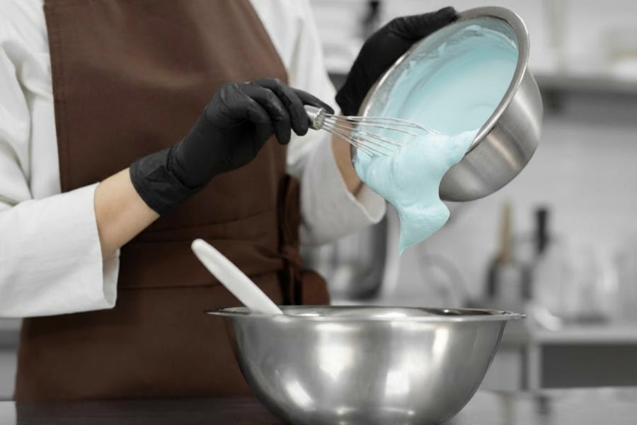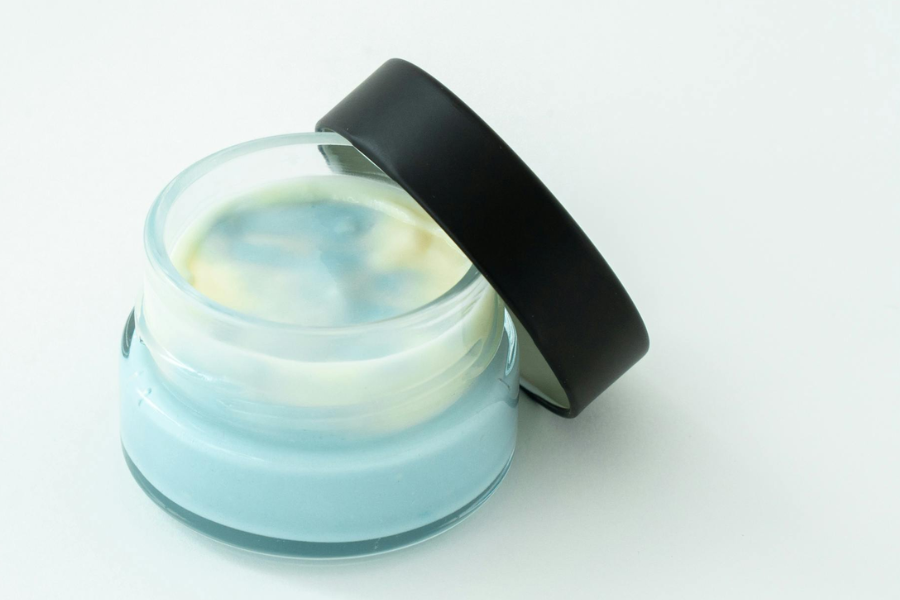 青いクリームには人工着色料を使わず、天然素材だけで発色させることに挑戦しました。最初はバタフライピーで試しましたが、日が経つごとに青がグレーやパープルへ変色。「やっぱり青は無理かもしれない…」と諦めかけたそのとき、出会ったのが天然色素リナブルー。この素材のおかげで、瓶越しに「海」を感じるような理想の青を再現できました。