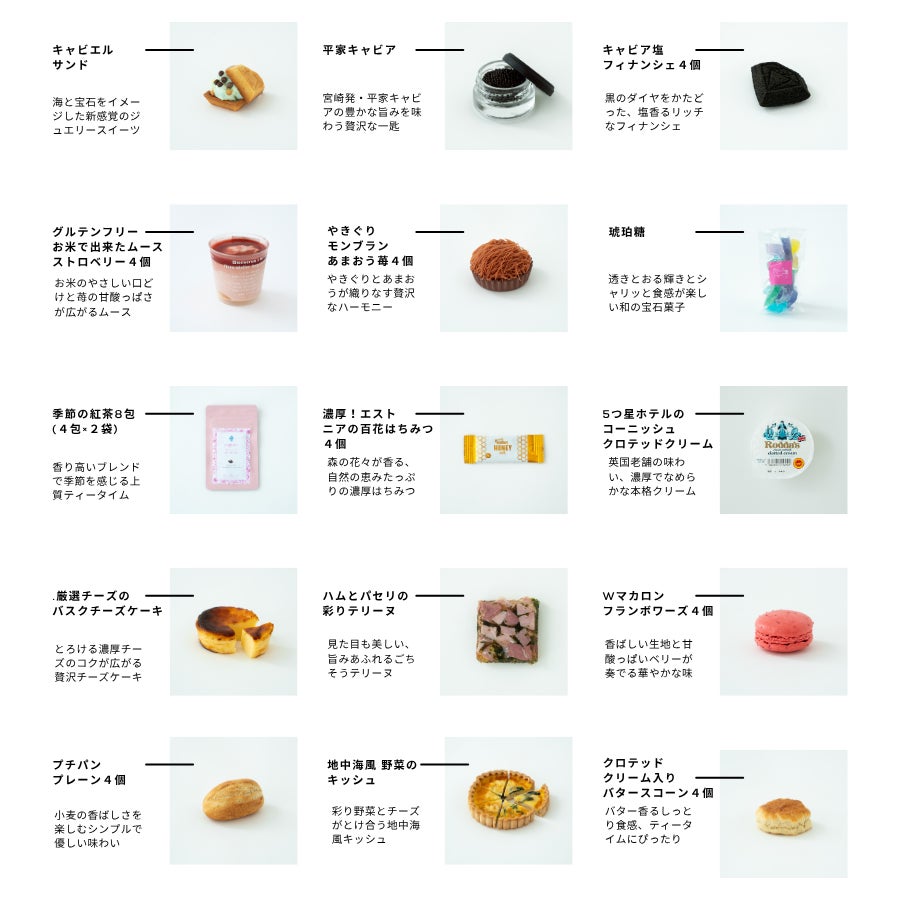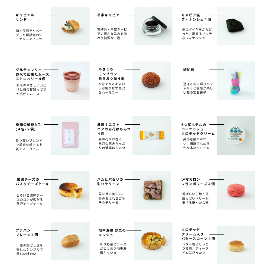 A. ビジュエルパフェが手がける、新作スイーツ「キャビエル・サンド」を中心とした特製アフタヌーンティーセットです。味わいや彩りの調和を大切に、スイーツ・デリ・紅茶をひとつひとつ丁寧に組み合わせました。ご自宅でも、ビジュエルパフェのアフタヌーンティーと同じ世界観をお楽しみいただけます。