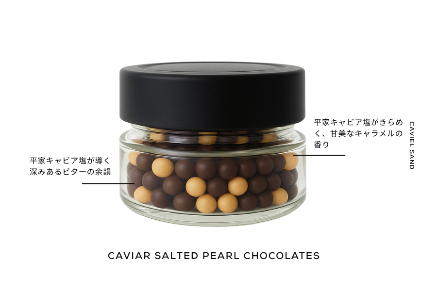 平家キャビア塩を忍ばせた黒と金の二色のパールチョコ。コク深い苦味のビターとまろやかな甘さが引き立つキャラメルに繊細な塩味が加わることで、これまでにない優雅な味わいを実現しました。