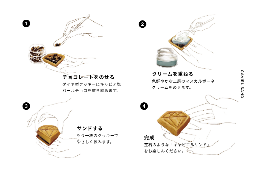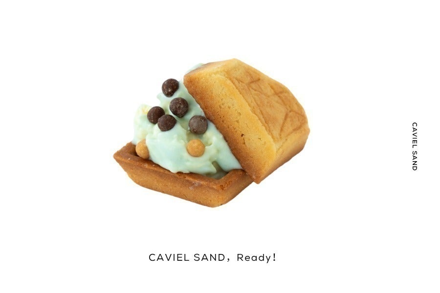 キャビエル・サンドは、キャビア塩の風味を最大限活かしたビターとキャラメル味のパールチョコレートと、海をイメージした二層のマスカルポーネクリームを、ダイヤモンド型クッキーで包み込んだ新感覚のプレスサンド。