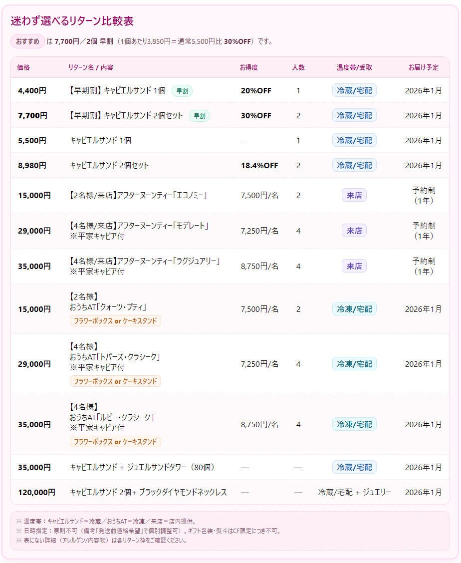 A. クラウドファンディング限定商品のため、ギフト包装・熨斗・メッセージ対応は行っておりません。ご自身へのご褒美やご家族でのティータイムとしてお楽しみください。