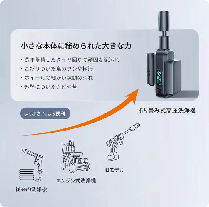 従来の大型洗車機の性能をミニサイズに凝縮した革命的な製品です。独自開発の一体式増圧モーター技術により、手のひらサイズでありながら1Mpaの圧力を実現。5種類の専用ノズルで、車洗いはもちろん、窓掃除、床清掃、ガーデニングまで、日常生活のあらゆる清掃ニーズに応えます。