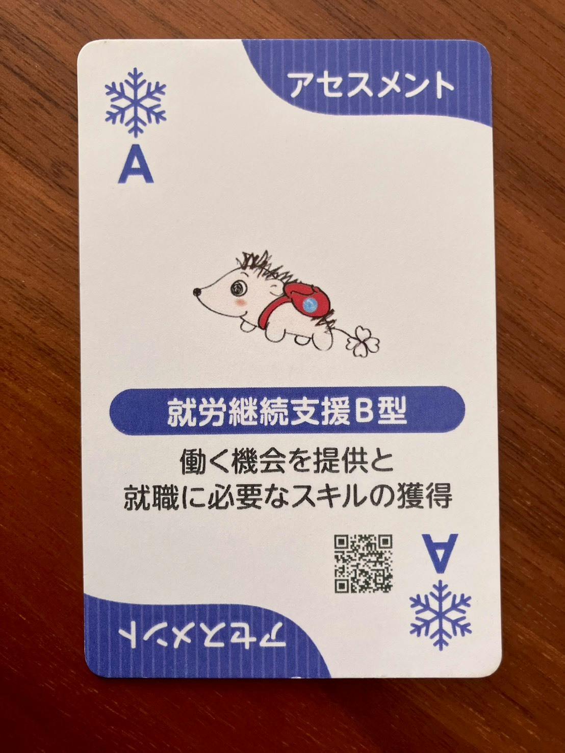カード構成はトランプと同じ54枚。春・夏・秋・冬の4マーク×1〜13の数字、そしてジョーカー的役割の「GIFTカード」。さらにカードの中央には、就労継続支援A/B型、ヘルパー、相談支援、病院、地域の人…など、全26種類の資源が描かれています。