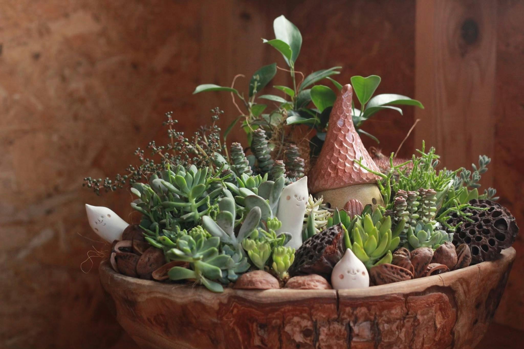 一緒にレストランの軒先でお花と陶器の移動販売を始め、やがて寄せ植えに、私のお人形を添えてもらうようになり、