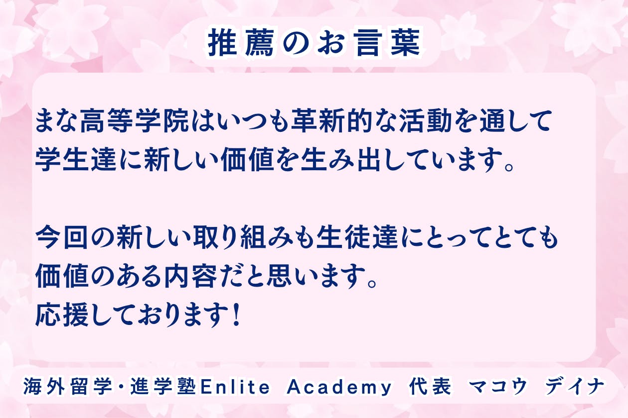 海外留学・進学塾Enlite Academy 代表 マコウ デイナ先生より「推薦のお言葉」をいただきました