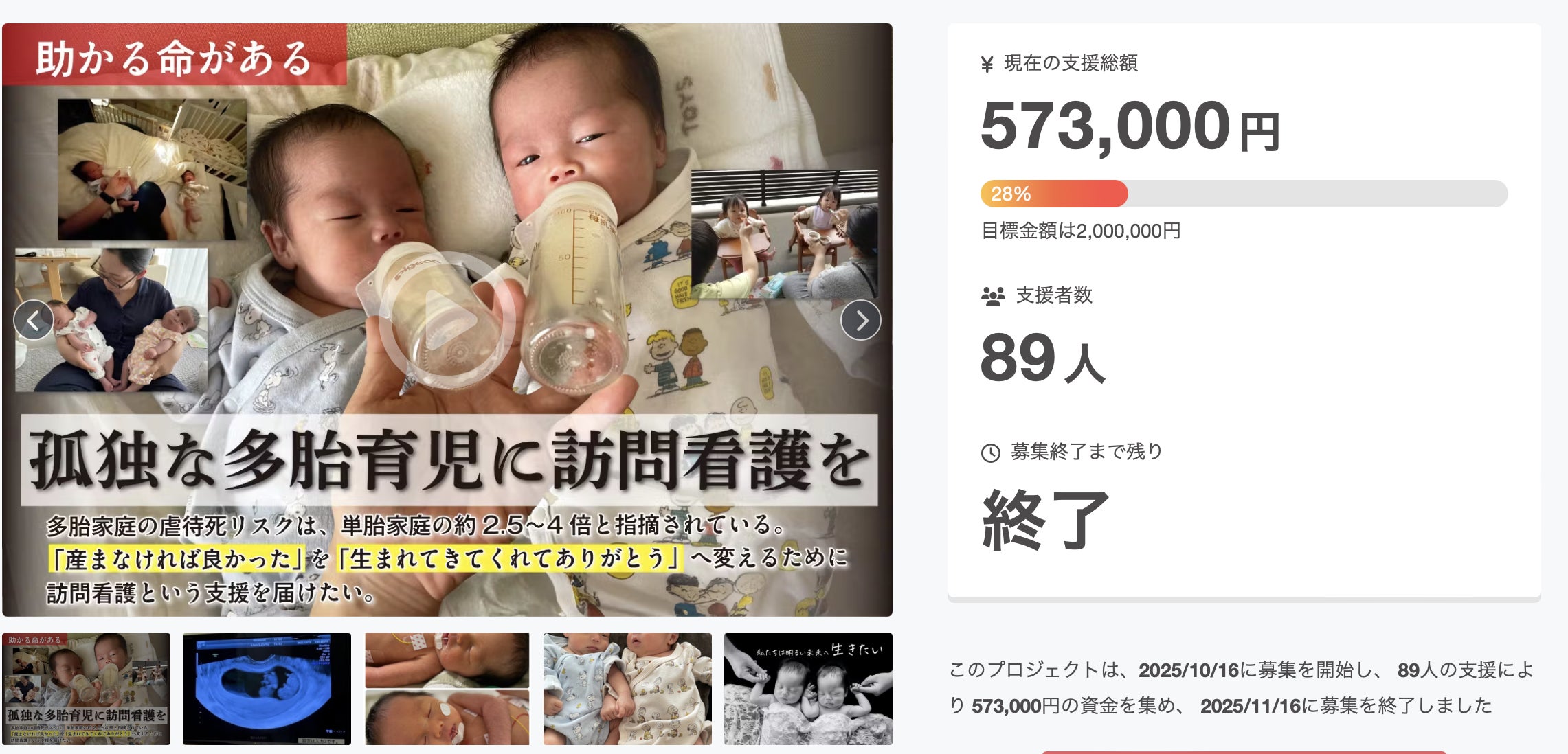 2025/11/15 17:22たくさんの想いに支えられています。本当にありがとうございます。10/17から始まったクラウドファンディングの挑戦も、いよいよ明日が最終日となりました。ここまでに 77名の方から 532,000円 のご支援を頂きました。お一人おひとりの気持ちが胸に沁みています。心からありがとうございます。この1ヶ月間、応援メッセージを読むたびに、「この活動は私ひとりのものじゃない」「必要としてくれている人が、ちゃんといる」そのことを強く感じ、何度も背中を押されました。多胎育児には、喜びと同じくらい…いえ、それ以上の孤独や不安がつきまといます。過去の私のように、助けを求められず限界を超えてしまうママを減らしたい。その想いだけで、ずっと走り続けてきました。明日で挑戦は一区切りを迎えますが、ここからが本当のスタートです。訪問看護という形で、確かな安心を届けられる場所を必ず作ります。「助けて」は弱さじゃない。子どもの命を守るための【強さ】だということを伝え続けていきます。最後に、この活動が必要なご家庭に届くよう、SNSなどでのシェア・拡散で応援していただけたら嬉しいです。このクラファンを通して、【産まなければよかった】ではなく【生まれてきてくれてありがとう】と言える家庭を増やせるよう、これからも進み続けます。ここまで応援してくださり、本当にありがとうございます。そして最後の1日、見守っていただけたら心強いです。多胎家庭が子育てしやすい社会は、すべての子どもたちを育てやすい社会になると信じています。どうぞよろしくお願いいたします。 もっと見る【1週間のご報告】たくさんの想いが集まっています。本当にありがとうございます。